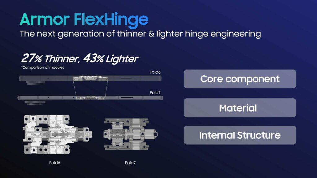Rozdiel medzi Galaxy Z Fold6 a Fold7 je zatiaľ najväčší v rámci vývoja tejto skladačky. Základom pántu zostala konštrukcia odvodená od vodnej kvapky.