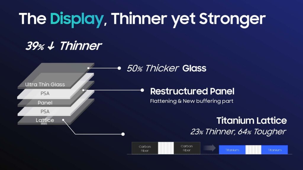 Základom je celkom nový titánový pánt, ktorý je teraz jednak tenší, ale aj robustnejší. Tenší je aj samotný displej a výrobca teraz použil odolnejší hliník na vonkajšiu konštrukciu Z Fold7.