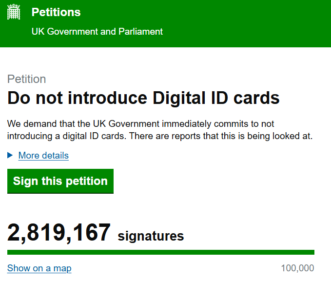 Petíciu proti zavádzaniu digitálneho ID a aplikácie GOV.UK Wallet na integráciu rôznych dokladov dosiahla viac ako 2,8 milióna podpisov. Systém centralizovanej správy vo forme digitálnej peňaženky má byť zavedený najneskôr do roku 2029. Pod pojmom digitálna peňaženka sa myslí aplikácia v mobile. Niečo podobné je aj na Slovensku.