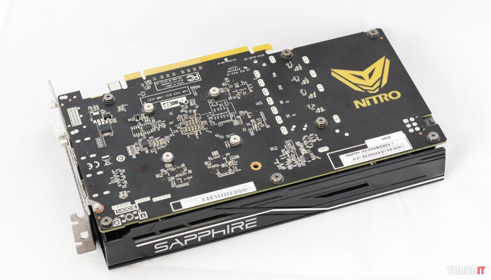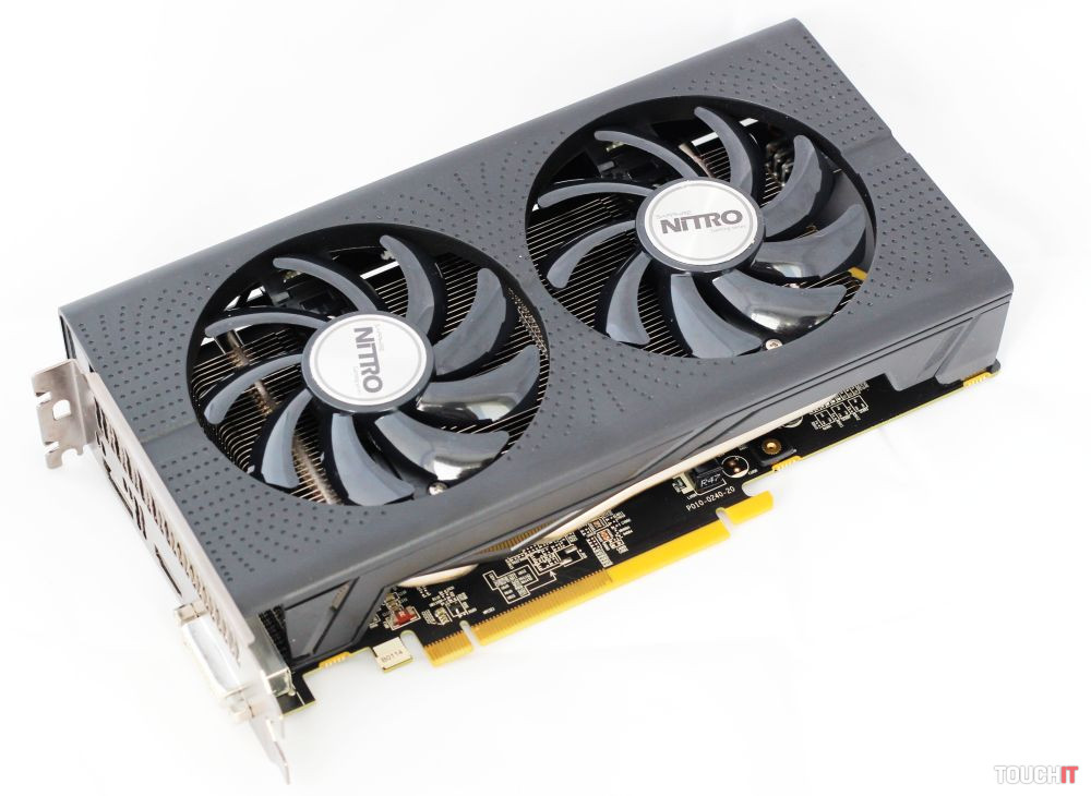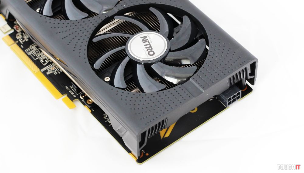 Ten je chránený veľkým plastovým krytom, pod ktorým sa ukrýva pomerne riedke rebrovanie s dvojicou heat-pipe trubíc vychádzajúcich z bloku nad GPU. Prúdenie vzduchu má na starosti dvojica nízkoprofilových ventilátorov s priemerom 90 mm a dvojitým guľôčkovým ložiskom. Chladič dokáže pracovať v čisto pasívnom režime a ventilátory sa aktivujú pri hranici 50°C. Pre jednoduchšie čistenie či výmenu sa ventilátory dajú poľahky odobrať, toto je niečo, na čo sme zvyknutí skôr vo vyšších cenových hladinách. Chýbať prirodzene nesmie ani podsvietenie. Modré LED sa nachádzajú pod druhým ventilátorom, dodávajú karte atraktívnejší vzhľad a zároveň svietia pod vyššie spomínaným logom NITRO. PCB mení farbu LED na modrozelenú a tento efekt vyzerá napríklad v skrinke s priehľadnom bočnicou veľmi zaujímavo.