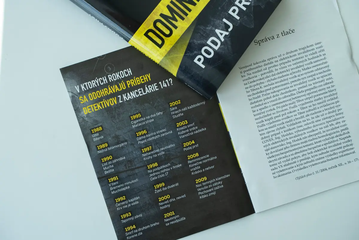 Najnovšia kniha nadväzuje na poslednú Dánovu knihu s názvom Vianočná nádielka, ktorej dej sa odohráva na Štedrý deň roku 2003. V horúcej novinke Podaj Prst je detektív Krauz vyslaný preveriť okolnosti podozrivej dopravnej nehody. Na mieste zistí, že ide o vraždu, ktorej obeťou je mladý policajt. Oddelenie vrážd čaká prípad plný zvratov a prekvapivých súvislostí. Ak by ste sa však rozhodli prečítať si aj iné knihy z dielne Dominika Dána, nie je potrebné ich čítať postupne. Doterajšie prípady sa odohrávajú v rozmedzí rokov 1988 až 2009, nie sú teda publikované chronologicky. V prípade, že predsa chcete začať prvým prípadom z kancelárie 141, známej aj ako „mordpartia“, odporúčame vám začať knihou Uzol, ktorá sa odohráva práve v roku 1988 a sleduje Richarda Krauza, ktorý sa stáva detektívom a začína sa jeho bohatá kariéra.
