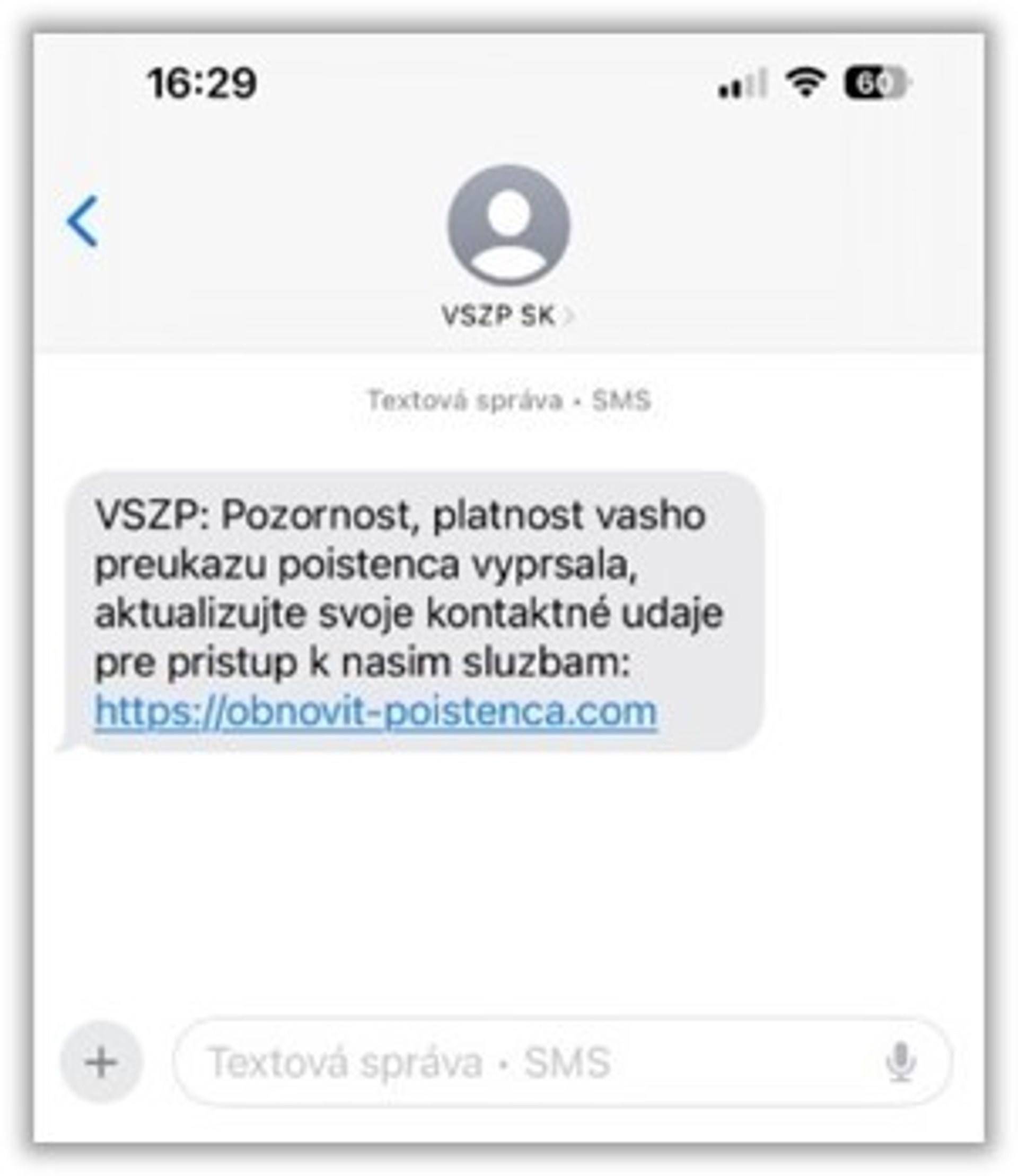 Podvodníci v nich zneužívajú VšZP a posielajú podvodné SMS správy obsahujúce informáciu o konci platnosti karty poistenca. Poistenci nájdu informácie o smishingovej kampani aj v mobilnej aplikácii VšZP.