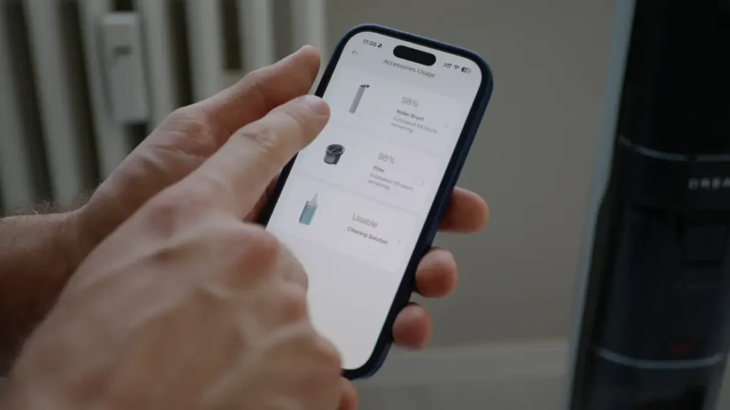 Cez aplikáciu zariadenie pri prvotnom nastavovaní pripájate aj k domácej Wi-Fi sieti. V nastaveniach aplikácie môžete spustiť samočistenie či sušenie mopovacieho valca, nastaviť si ich automatizáciu po vložení do dokovacej stanice, alebo si samotné sušenie načasovať na obdobie, keď nie ste doma.