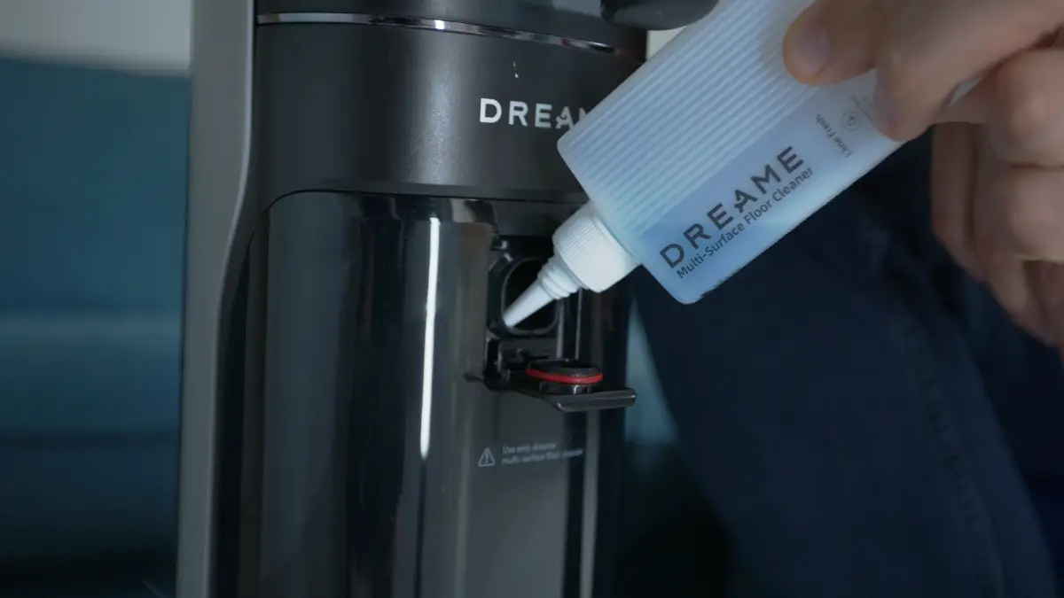 Mopovač čistí podlahy aj s použitím čistiaceho prostriedku, na ktorý slúži špeciálna nádržka v tele mopovača. Vždy používajte iba originálny čistiaci prostriedok od Dreame. Mopovač ho inteligentne dávkuje podľa znečistenia a jedna naplnená nádržka by mala vydržať približne jeden mesiac upratovania.