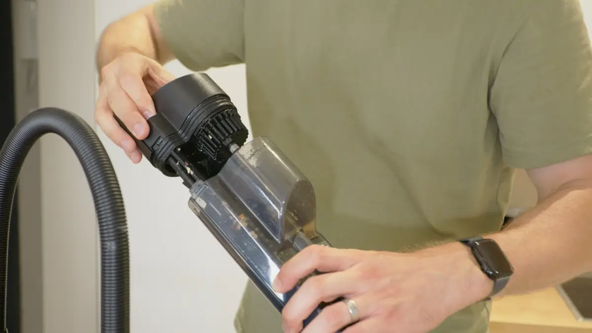 Stačí, že stlačením tlačidla na tele mopovača uvoľníte hlavnú jednotku, nasuniete na ňu odpadovú nádobu s cyklónovou filtráciou a potom už len požadovaný nadstavec.
