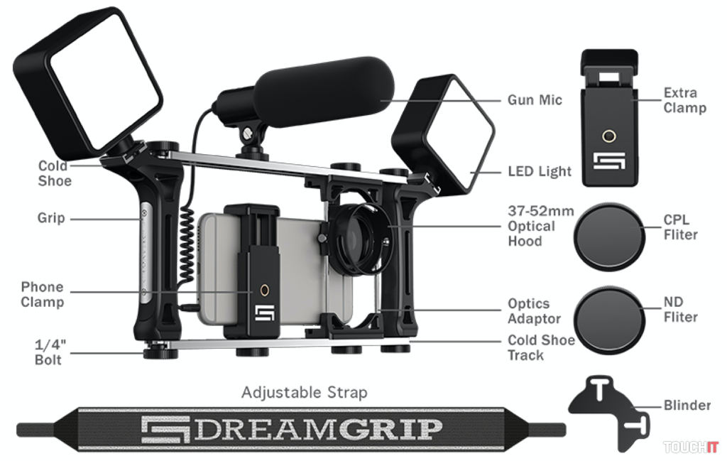 Zostava môže mať rôzne podoby – môžete mať vložený smartfón, nainštalovanú veľkú clonu s CPL filtrom, na vrchnej koľajnici mikrofón a v druhom držiaku powerbanku, ktorá bude napojená na telefón. Na koľajniciach rukovätí môžu byť svetlá z balenia, aby bola scéna dostatočne presvetlená a výsledné zábery dokonalé. Nie je tajomstvom, že pomocou smartfónu vzniklo už aj niekoľko veľkých filmov, pričom bolo vždy použité nejaké príslušenstvo. Ďalšou výhodou gripu je, že si môžete neustále dokupovať príslušenstvo podľa potreby, aj od iných výrobcov, pričom ho na DREAMGRIP vždy nejakým spôsobom pripevníte. Skrátka, skvelé zariadenie, ktoré vám môžeme iba odporučiť.