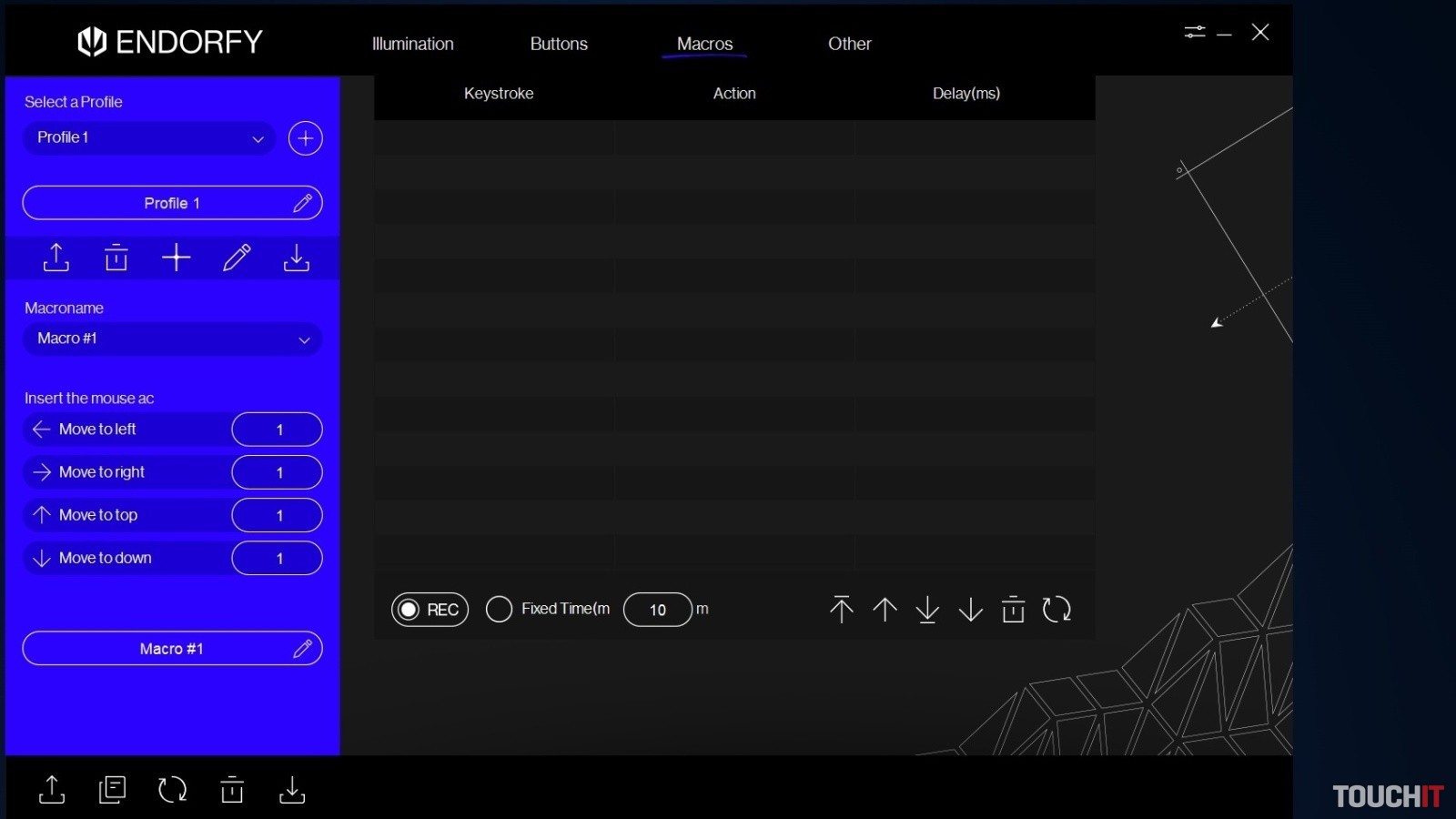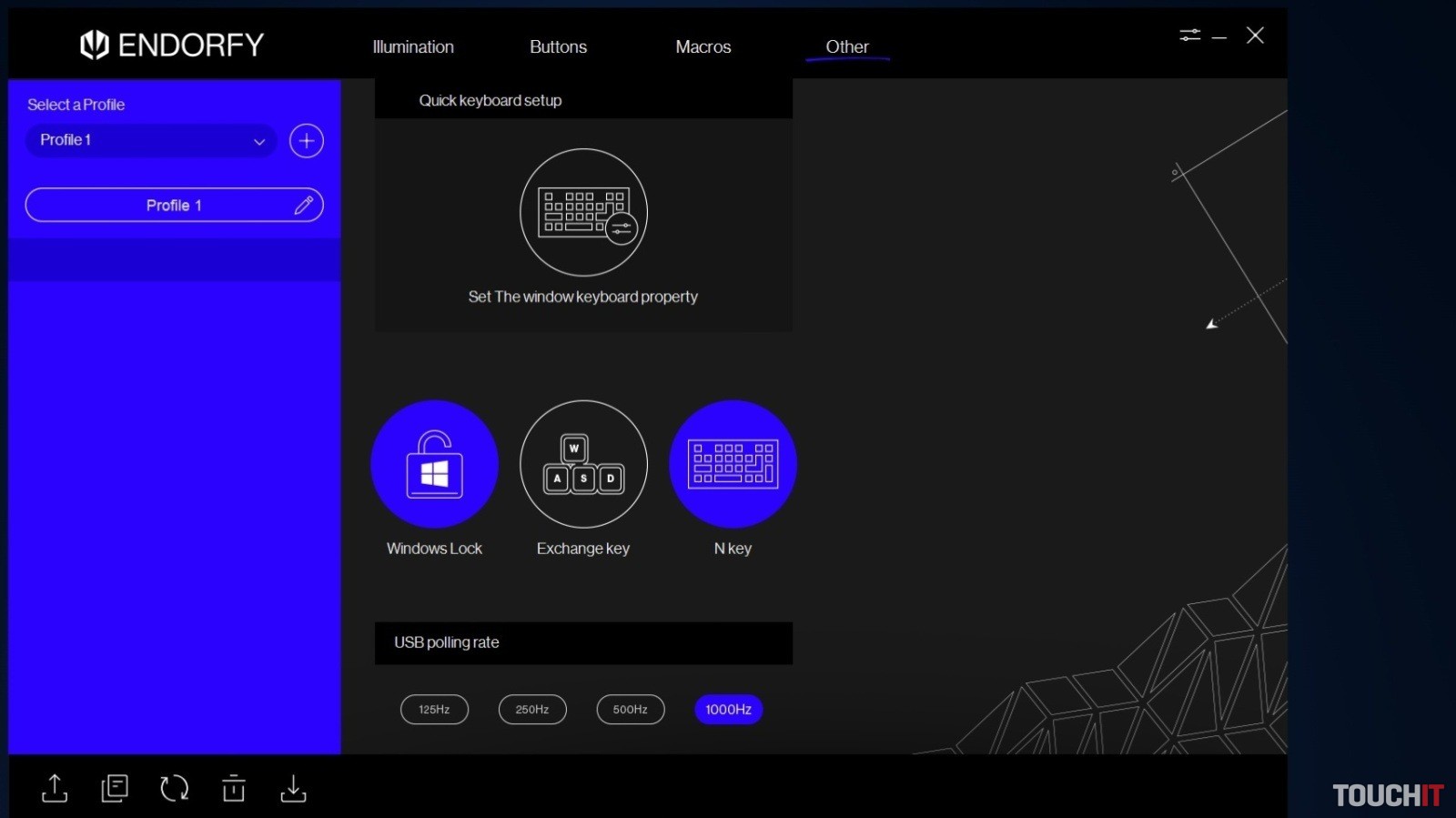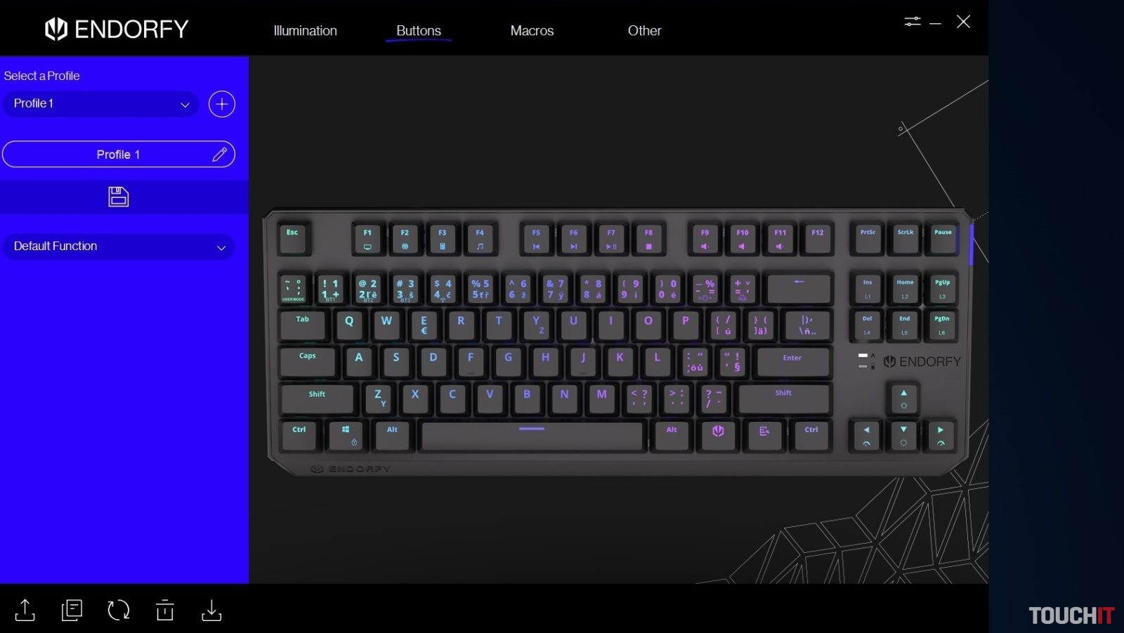 Hoci klávesnica má kompaktné rozmery, tak jej okrem numerickej časti nič dôležité nechýba. Všetko nastavíte pomocou vyhradenej klávesy s logom Endorfy, čím aktivujete multimediálne funkcie, alebo nastavíte aj všetky požadované parametre. Týmto spôsobom môžete nastaviť napríklad hlasitosť, pretáčať alebo pozastaviť hudbu, ale aj veľa ďalších funkcií, ktoré sú od hernej klávesnice očakávané.