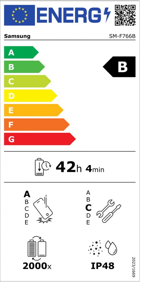 Nedávno zverejnené oficiálne energetické štítky EÚ potvrdzujú, že Galaxy Z Flip7 bude mať batériu s nominálnou kapacitou 4174 mAh (typická 4300 mAh). Na jedno nabitie vydrží 42 hodín a 4 minúty, čo bude radiť Galaxy Z Flip7 do energetickej triedy B.
