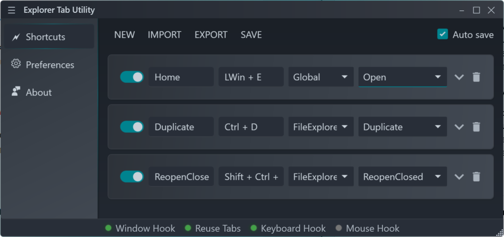 Konkrétne správanie na vyvolané udalosti, klávesovou skratkou alebo myšou si nastavujete v okne programu. Udalosti si nastavíte a pridáte podľa vlastného uváženia. Štandardné prispôsobovanie obsahuje 3 reakcie, a to zachytenie spomínanej klávesovej skratky na otvorenie novej karty namiesto spustenia nového okna, duplikovanie aktuálnej karty cez klávesovú skratku Ctrl + D a znovuotvorenie zatvorenej karty (Ctrl + Shift + T).