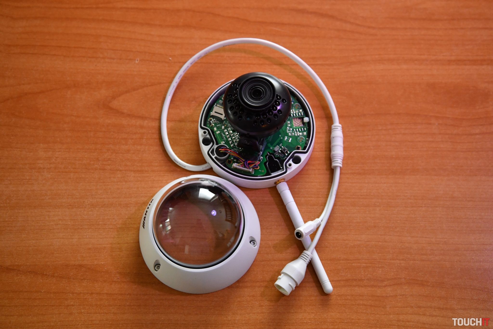 Ak si prezeráte obraz z kamery v reálnom čase, tak si môžete manuálne vytvoriť fotografiu alebo video záznam, ktorý sa uloží do pamäte zariadenia s dostupnosťou v aplikácii. Samozrejmosťou je teda detekcia pohybu, ako aj možnosť aktivácie notifikácií. Ak kamera zachytí pohyb, tak ho nahrá, a pritom vás na to upozorní. Vítanou funkciou je možnosť nastaviť časové rozmedzie – odkedy/dokedy vám majú notifikácie prichádzať. K pokročilejším funkciám by sme priradili aj možnosť označenia oblasti na sledovanej scéne (tieňovanie), ktorá nie je podstatná a kamera na pohyb v tejto časti nebude reagovať, resp. nebude vytvorená nahrávka. V aplikácii si tiež môžete pozrieť stav ukladania, resp. vášho úložiska, či už je to cloud alebo pamäťová karta. Samozrejmosťou je možnosť zmeny všetkých hesiel alebo zmeny názvov kamier. Podstatnou funkciou je zdieľanie náhľadu z kamier až 6 používateľom/1 kamera. Užívateľ, ktorému kameru zdieľate vidí obraz v reálnom čase, a tiež si vie pozrieť nahrávané záznamy. K nastaveniam sa však nedostane. Zdieľanie je jednoduché, stačí zadať email druhého používateľa, ktorý musí mať aplikáciu a vytvorený účet, to je všetko. Ten si následne „refrešne“ plochu v aplikácii a kamera sa mu v okamžiku zobrazí. Prejdime k samotným zariadeniam, ktoré si rozoberieme iba do tej miery, po ktorú vás pustí aplikácia. Ako sme vyššie uviedli, ANTIK sa snaží ísť cestou jednoduchosti, tzv. – „user friendly“ , a preto sprístupnil iba úplný základ nastavení kamier, čo zbytočne nezaťažuje používateľa. Preto je tento systém určený tým, ktorí si chcú kameru kúpiť, pripevniť, jednoducho nainštalovať a používať, bez ďalšieho rozmýšľania nad nastaveniami. Ak si ich však kúpi znalý používateľ, bude vedieť využiť potenciál týchto kamier aj inak, resp. mimo predvolenej aplikácie, ale to teraz nie je cieľom. Základným a v podstate aj „kompletným“ nastavením všetkých kamier je zobrazenie streamu v maximálnej alebo zníženej kvalite (HD/SD), a tiež možnosť sledovania obrazu na celej ploche. Dôležité upozornenie – bezproblémová funkčnosť kamier a stabilita prenosu záleží aj od vášho internetového pripojenia. ANTIK SmartCAM SCE 30 / SCE 35 Rovnaké označenie, rozdielne čísla. Tieto dve kamery sú parametrovo úplne totožné a líšia sa iba vyhotovením. SCE 30 je klasická „bullet“ kamera, ktorá sa inštaluje najjednoduchšie. Táto však má jednu nevýhodu, ktorou je zle umiestnená anténa, čím je jej nastavenie na presnú pozíciu o čosi ťažšie. Inak nemá žiadne výrazné nedostatky. SCE 35 je „dome“ kamera, ktorá sa inštaluje na podhľad alebo klasicky na stenu, podľa potreby. Pod skleneným krytom je snímač na pohyblivej hlave, ktorá je z časti nastaviteľná. Tento model je odolný voči vode a prachu – IP67, a tiež má certifikáciu IK 10 – „antivandal“. Rozbíjať sme ju neskúšali, ale niečo by vydržať mala. Model SCE 30 je odolný iba voči vode a prachu – IP77.bežné zobrazenie + 100% výrez