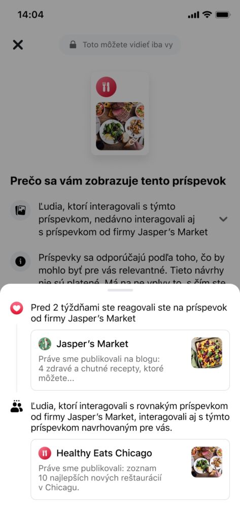 - Poloha: Navrhovaný príspevok sa môže používateľom zobraziť na základe ich polohy a toho, na čo reagujú ľudia v ich okolí.
