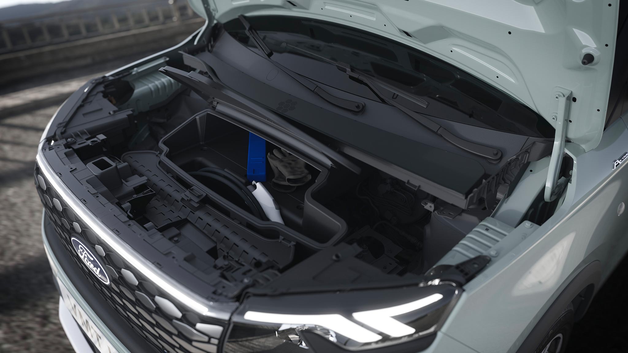 Elektrický model E‑Tourneo Courier vyniká aj špecifickým dizajnom prednej časti, praktickým 44-litrovým batožinovým priestorom vpredu a rozšírenými špecifikáciami štandardnej výbavy, ako sú napríklad väčšie digitálne displeje či komplexné asistenčné funkcie pre vodiča.