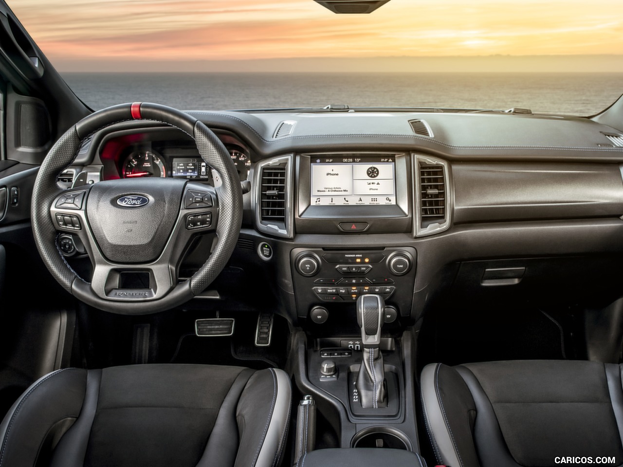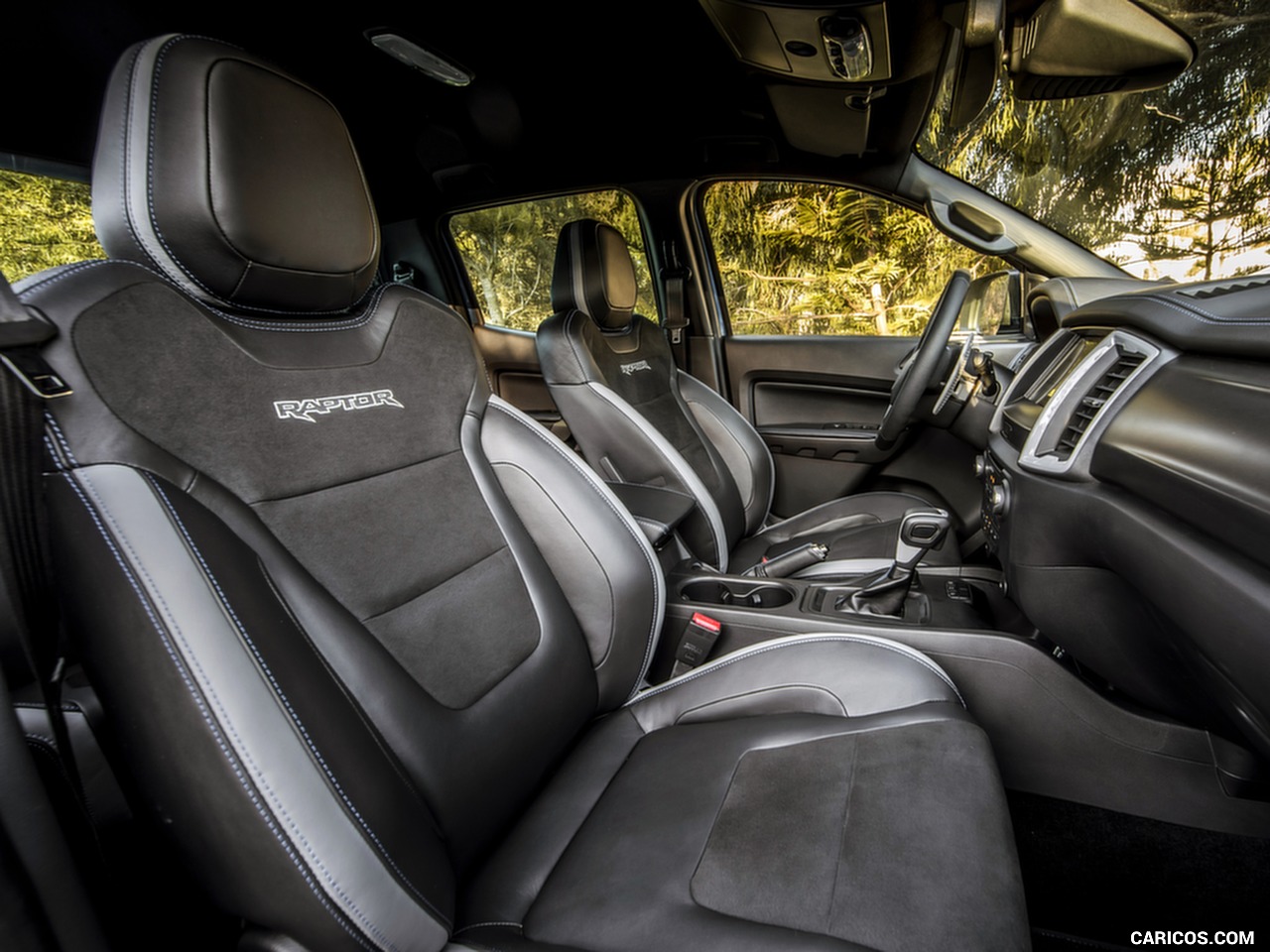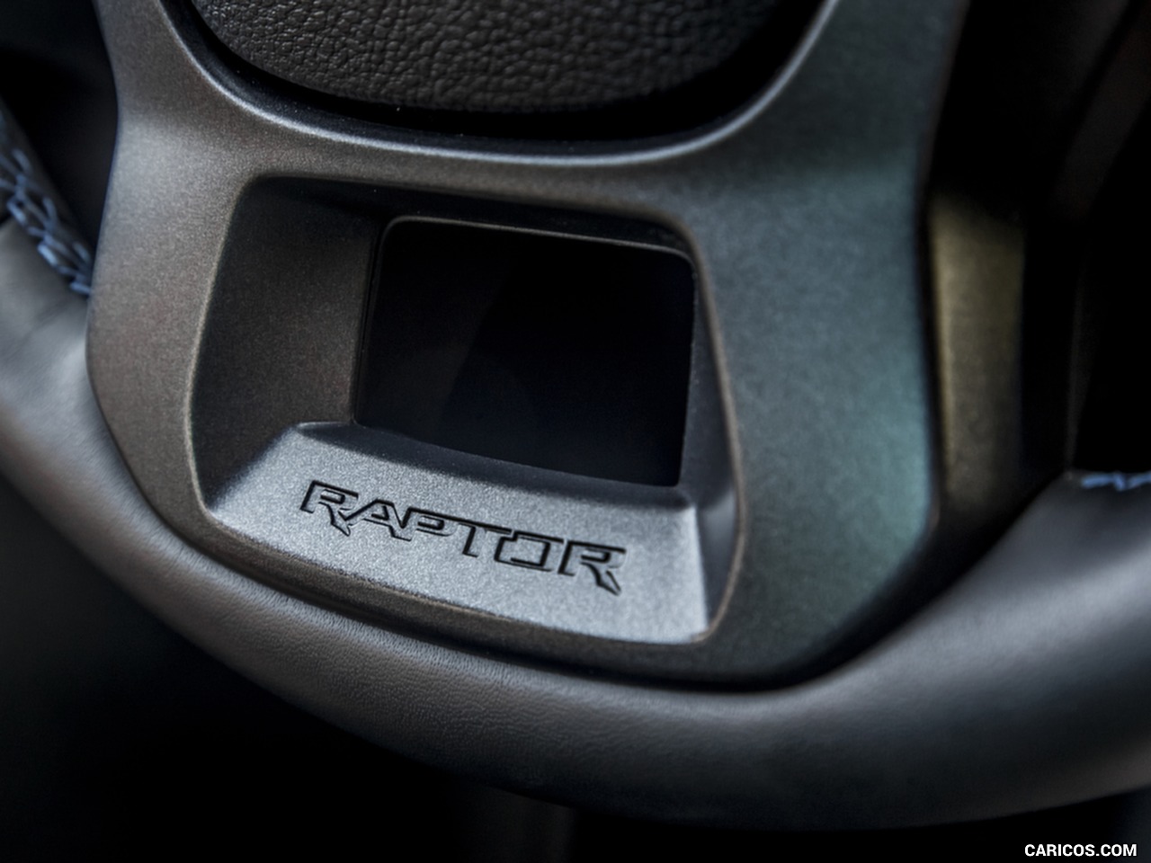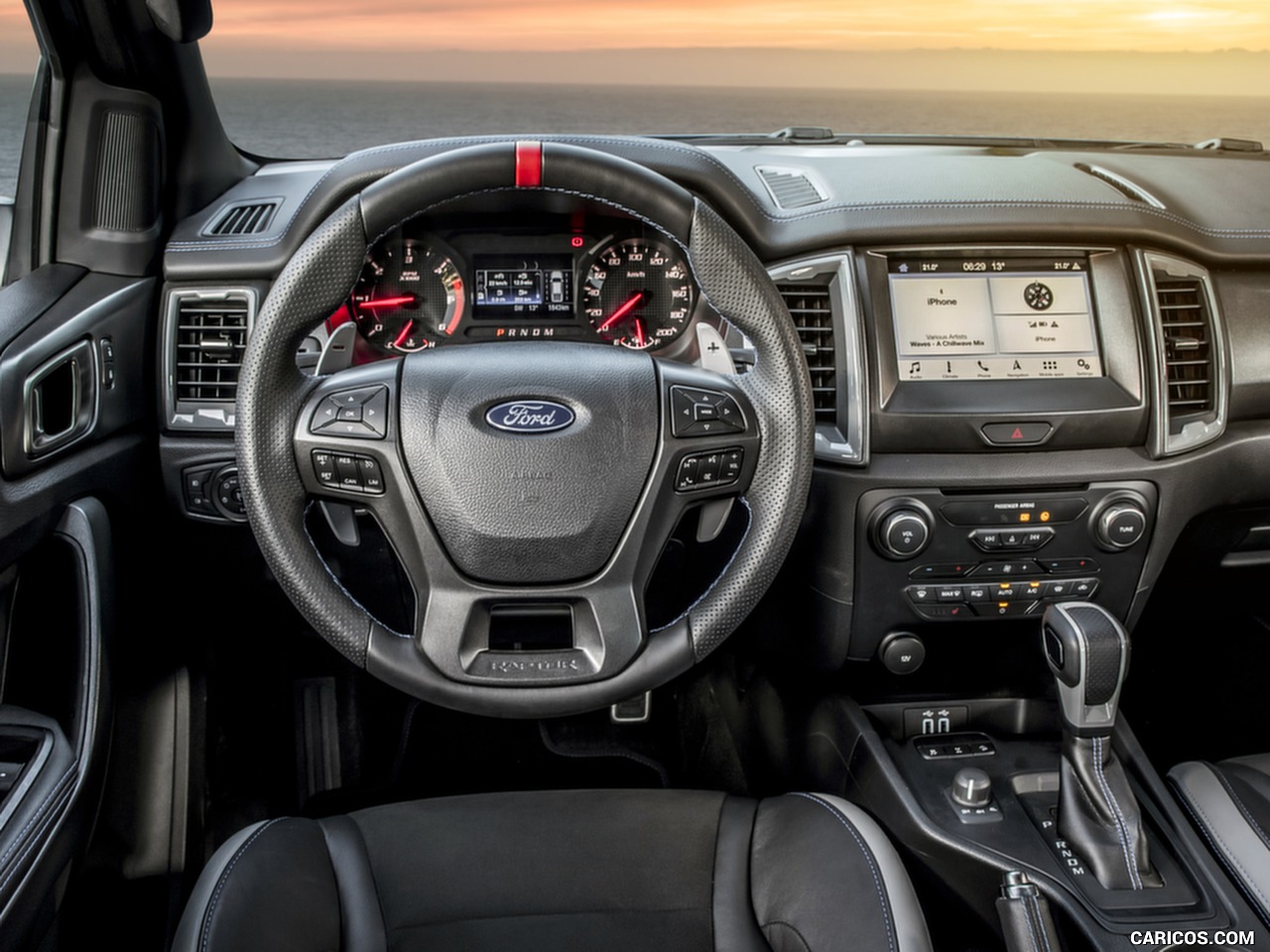 Na záver sa pozrime do interiéru, ktorý je v základe totožný s Rangerom, no niekoľko dôležitých odlišností spoznáte veľmi rýchlo. V prvom rade sú to kožené sedadlá, kombinované so semišom + modrým prešívaním (to sa objavuje v rôznych častiach interiéru) a nechýba ani logo RAPTOR, aby ste mali na pamäti, s kým máte dočinenia.