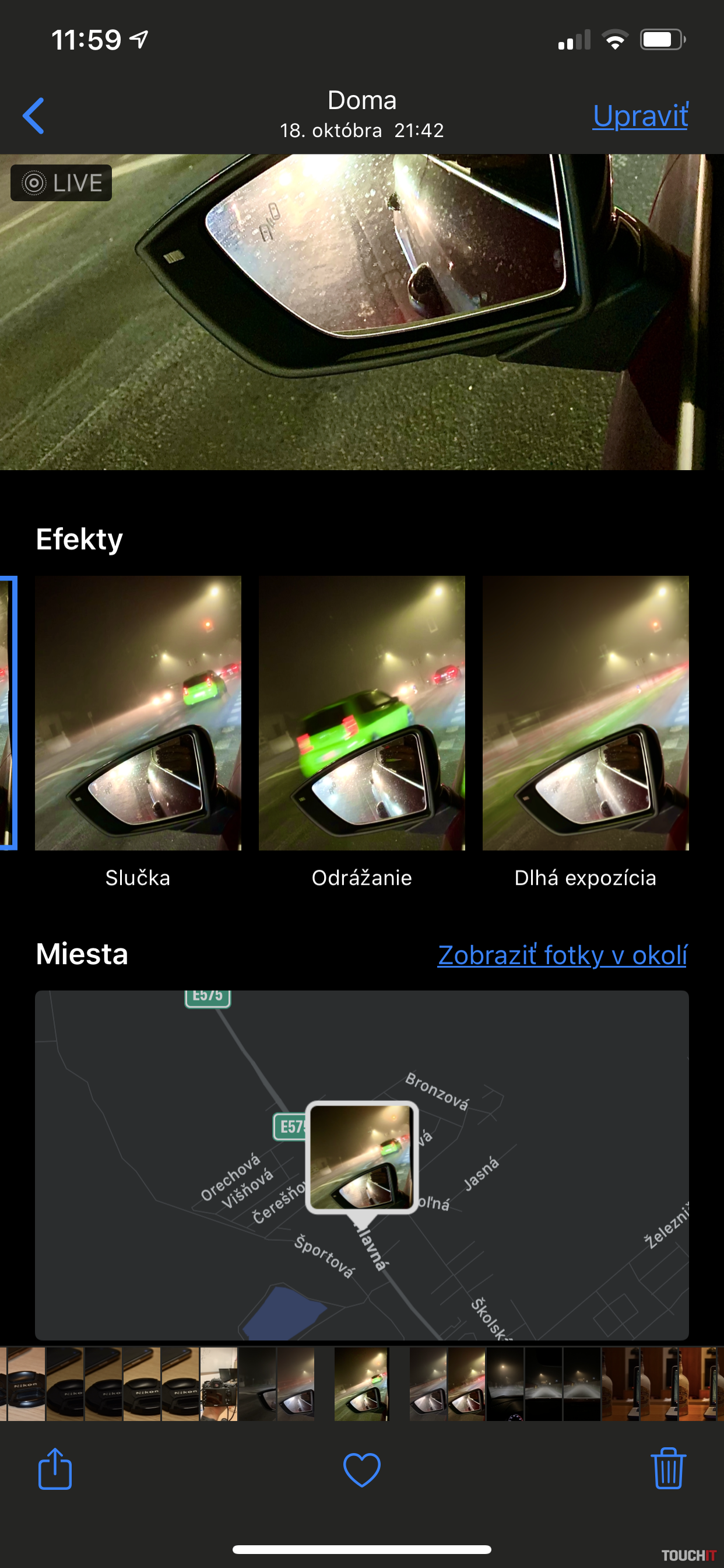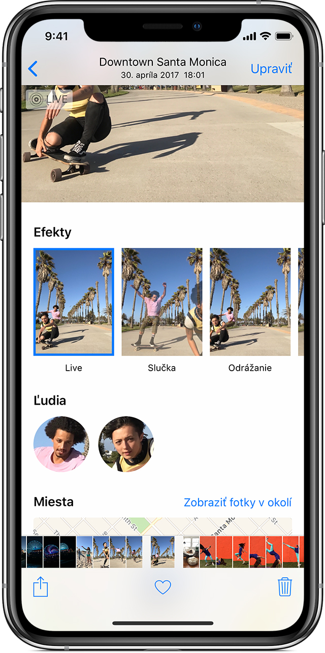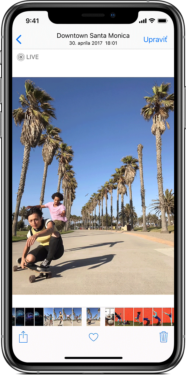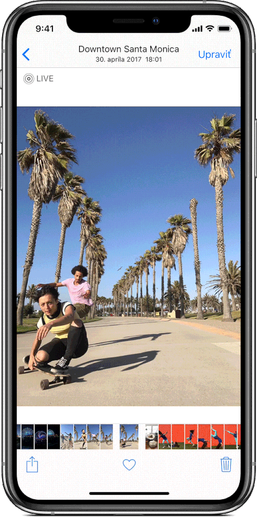 Live Foto je funkcia, ktorá je dostupná iba v režime „foto“ a okrem samotnej snímky zachytáva aj dej pred a po kliknutí na spúšť. Celkovo sú to 3 sekundy (1,5 pred / 1,5 po). Vo výsledku to znamená, že s takouto fotkou viete ďalej pracovať a prispôsobovať ju podľa predstáv. V galérii si danú fotku otvoríte a môžete prejsť k úpravám – kliknutím na upraviť.