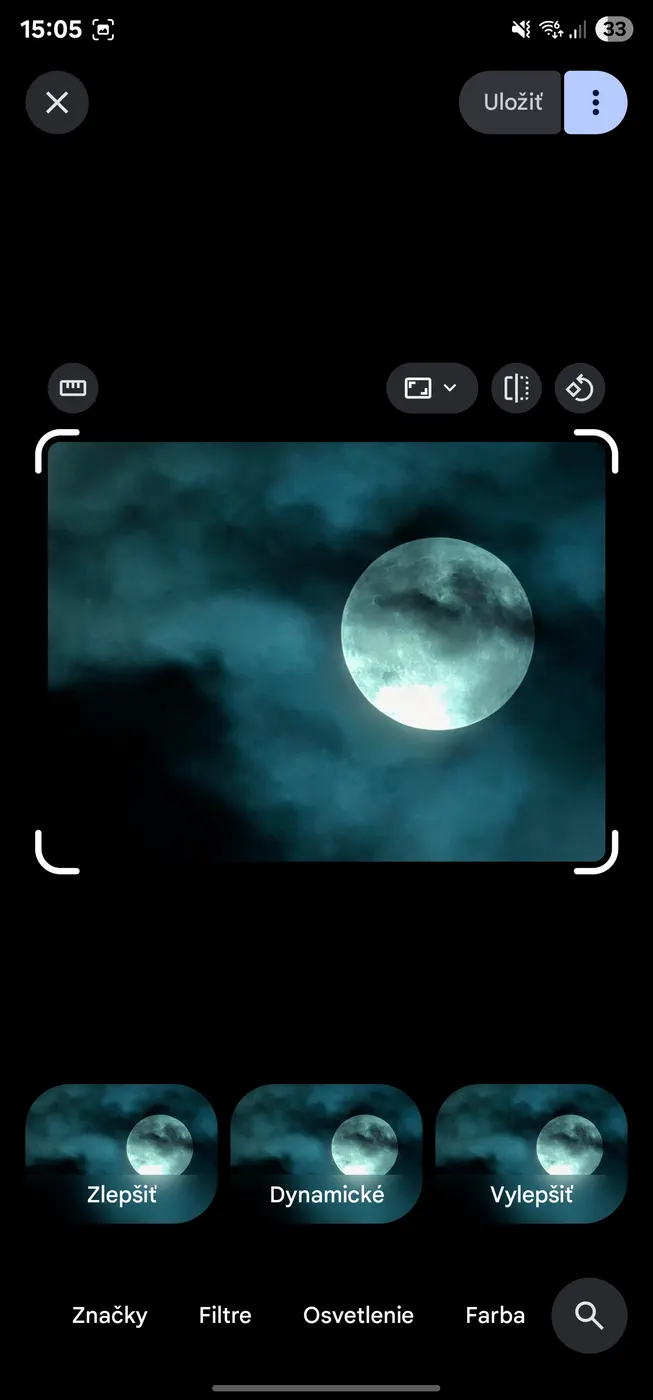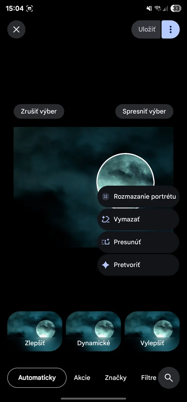 Na spodnej časti obrazovky sa objavuje nová prepracovaná ponuka so šiestimi kategóriami nástrojov: Automaticky, Akcie, Značky, Filtre, Osvetlenie a Farba. Napríklad v záložke Automaticky sa nachádzajú možnosti ako Zlepšiť, Dynamické a možnosť Vylepšiť, ktorá kombinujú viaceré editovacie nástroje pre rýchle vylepšenie snímky s využitím umelej inteligencie.