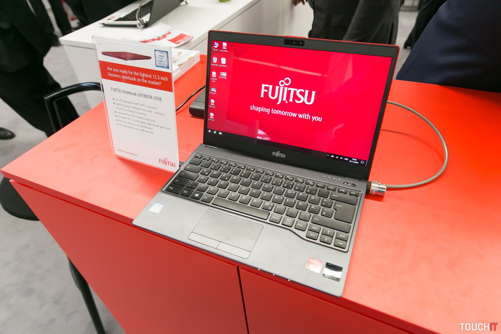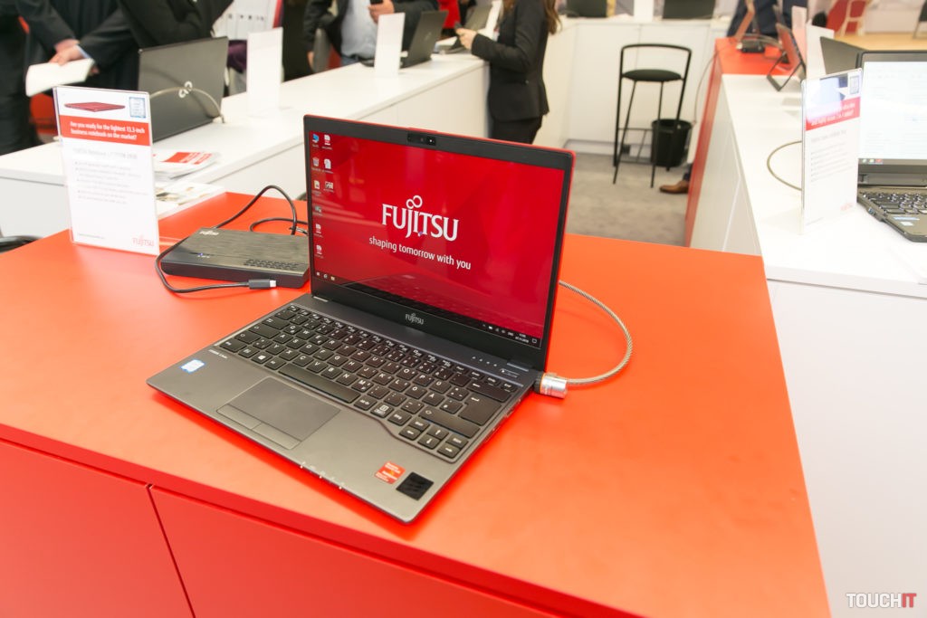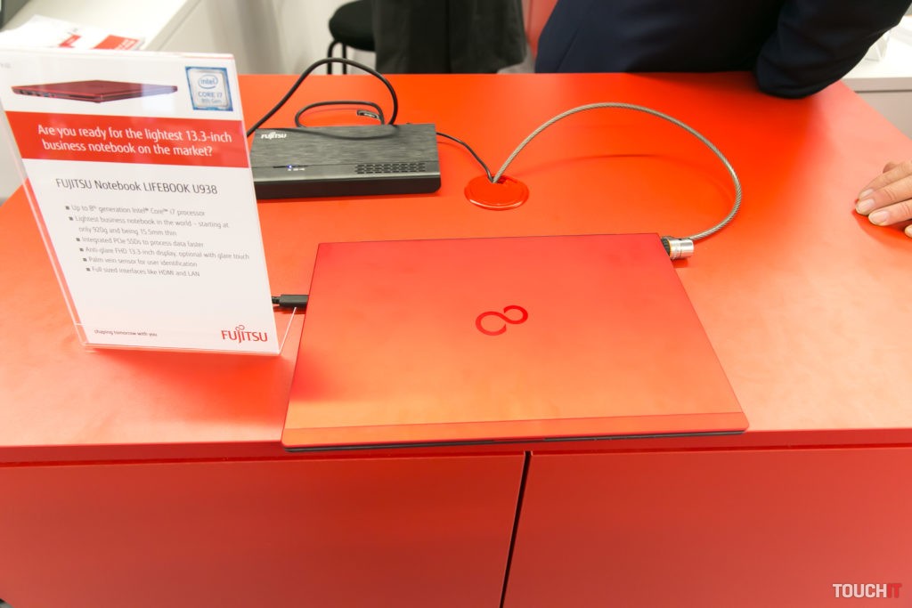 Čerešničkou na torte bol notebook LIFEBOOK U938 v krásnej červenej farbe. Je to úplne najľahší biznis notebook na svete s 13,3 palcovým displejom. Vo výbave je 8. generácia procesora do Intel Core i7, pričom hmotnosť tohto notebooku je len 920 gramov. Hrúbka notebooku je je 15,5 mm, vo výbave je SSD disk s PCIe pripojením. Kapacita SSD môže byť až 1 TB a RAM má kapacitu až do 20 GB. 13,3 palcový displej je tmavý, neodráža svetlo, ak budete priať dotykový displej, ten už bude lesklý. Rovnako si môžete vybrať, či sa budete do počítača prihlasovať cez odtlačok prsta alebo s rozpoznaním cievneho riečišťa na svojej dlani – PalmSecure (to Fujitsu viac odporúča). Nás potešili aj poty v plnej veľkosti – HDMI a tiež Ethernet. Tak to má byť. Veríme, že budúci rok sa tento notebook objaví aj s displejom otočným o 360°. Zatiaľ je prísľub výrobcu na podsvietenú klávesnicu a ešte o niečo nižšia hmotnosť. Cena súčasného modelu je od 1350 eur vyššie.