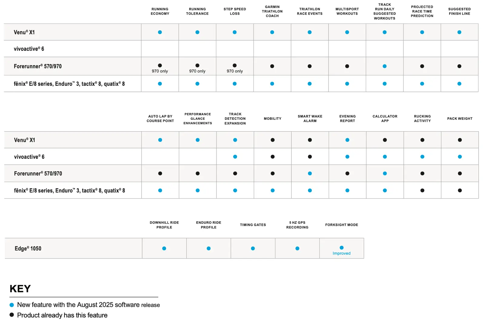 Novinkou sú aj ďalšie funkcie zo série Forerunner 970 a 570, ako sú multišportové cvičenia, nové cvičenia na mobilitu, večerné hlásenia a ďalšie. Kompletný zoznam nových funkcií pre jednotlivé hodinky si môžete pozrieť na priloženom obrázku.