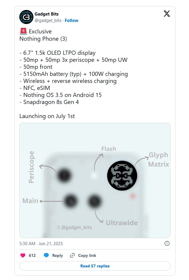 Záznam z testov tiež ukazuje, že Phone (3) má 16 GB RAM a beží na Androide 15, pravdepodobne s nadstavbou Nothing OS 3.3 (3.5). Podľa najnovších únikov by mal Nothing Phone (3) ponúkať 6,7-palcový LTPO OLED displej, batériu s kapacitou 5150 mAh a 100 W nabíjaním, ako aj štyri 50 Mpx fotoaparáty – tri vzadu a jeden vpredu, vrátane hlavného, ultraširokouhlého a periskopického objektívu s 3× priblížením.