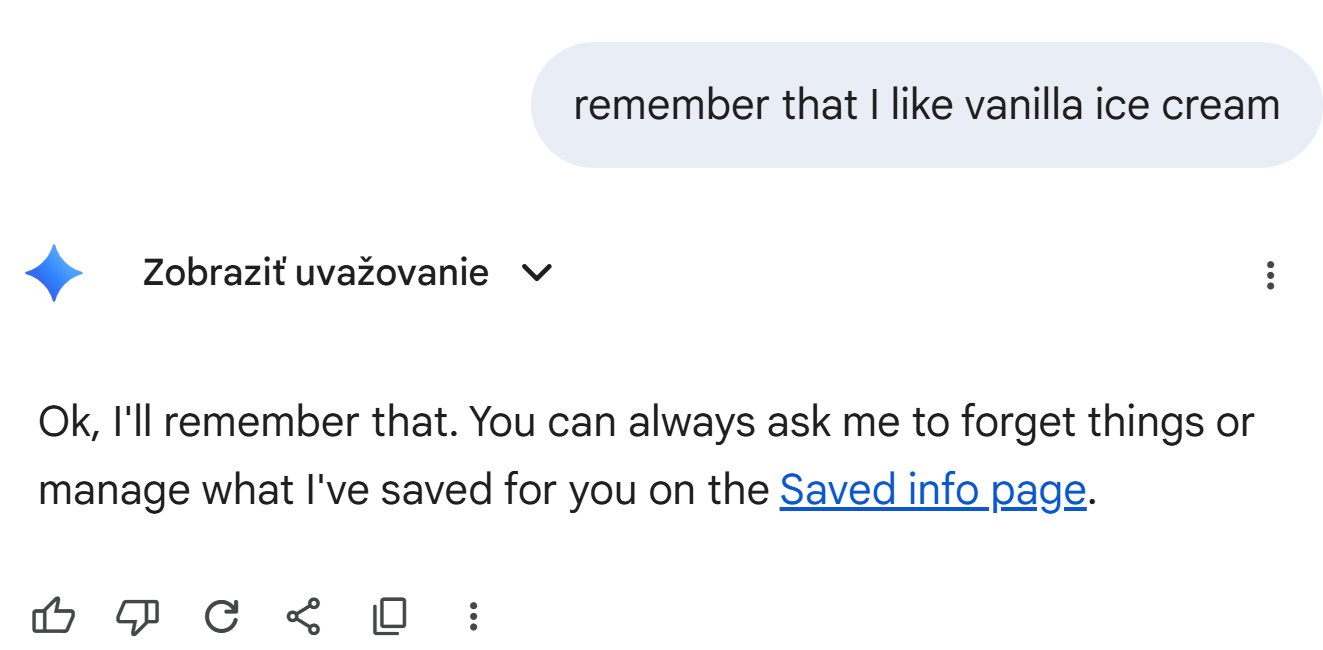 AI môžete učiť, aby si pamätala veci do budúcna. Táto pamäť je už štandardnou súčasťou viacerých AI, napríklad aj ChatGPT. Gemini obsahuje chybu, pri ktorej si zapamätá veci len v rámci konverzácie. To nedáva zmysel, predsa v jednej konverzácii vychádzame, že celý obsah je súčasťou kontextového okna.