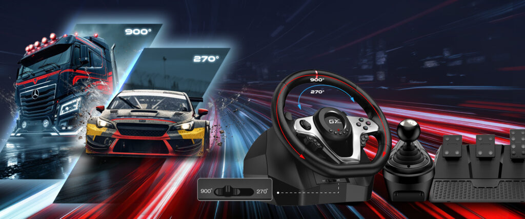 Volant pôsobí solídne – plast je pevný, úchop príjemný. Hlavnou zbraňou tohto modelu je možnosť prepínať medzi rozsahom otáčania 900° a 270°. To znamená, že si ho prispôsobíte podľa toho, čo hráte. Ak zapnete Euro Truck Simulator, využijete plných 900°, presne ako v reálnom kamióne. Ak prechádzate na F1 alebo arkádové preteky, 270° vám dá rýchlejšie reakcie.
