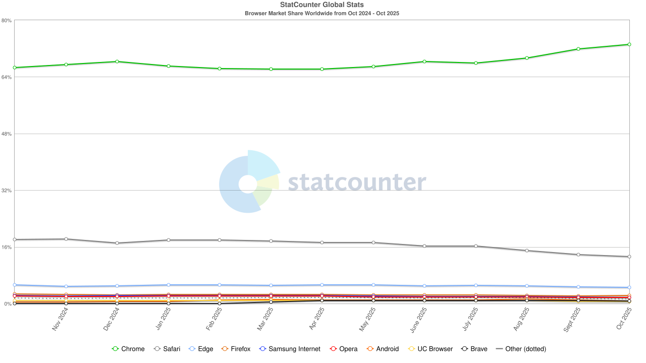Google Chrome je najpoužívanejší prehliadač. Podľa webu Statcountertrhový podiel viac ako 73 % od októbra minulého roku po október 2025. Mnohé prehliadače budú blokovať cookies tretích strán, ak im to umožníte a vyriešia tento problém za vás. Aj keď Google od tejto iniciatívy postupne upúšťa.