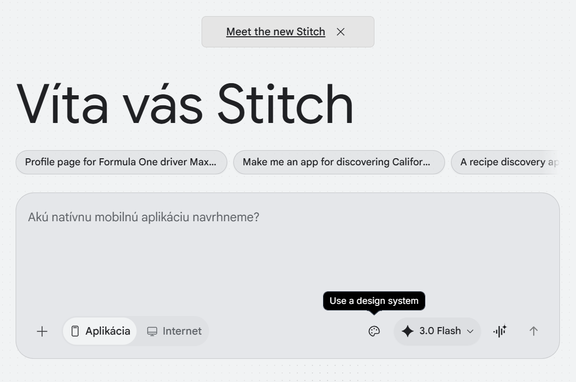 Základný princíp fungovania Google Stitch je podobný ako pri iných AI nástrojoch na text či obrázky. Zadáte jednoduchý prompt, napríklad pre mobilnú alebo webovú aplikáciu / stránku a opíšete, čo by mala obsahovať.