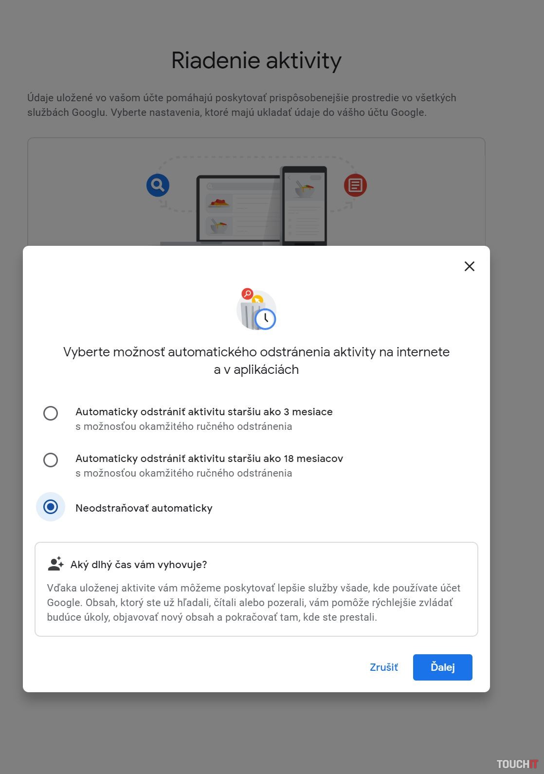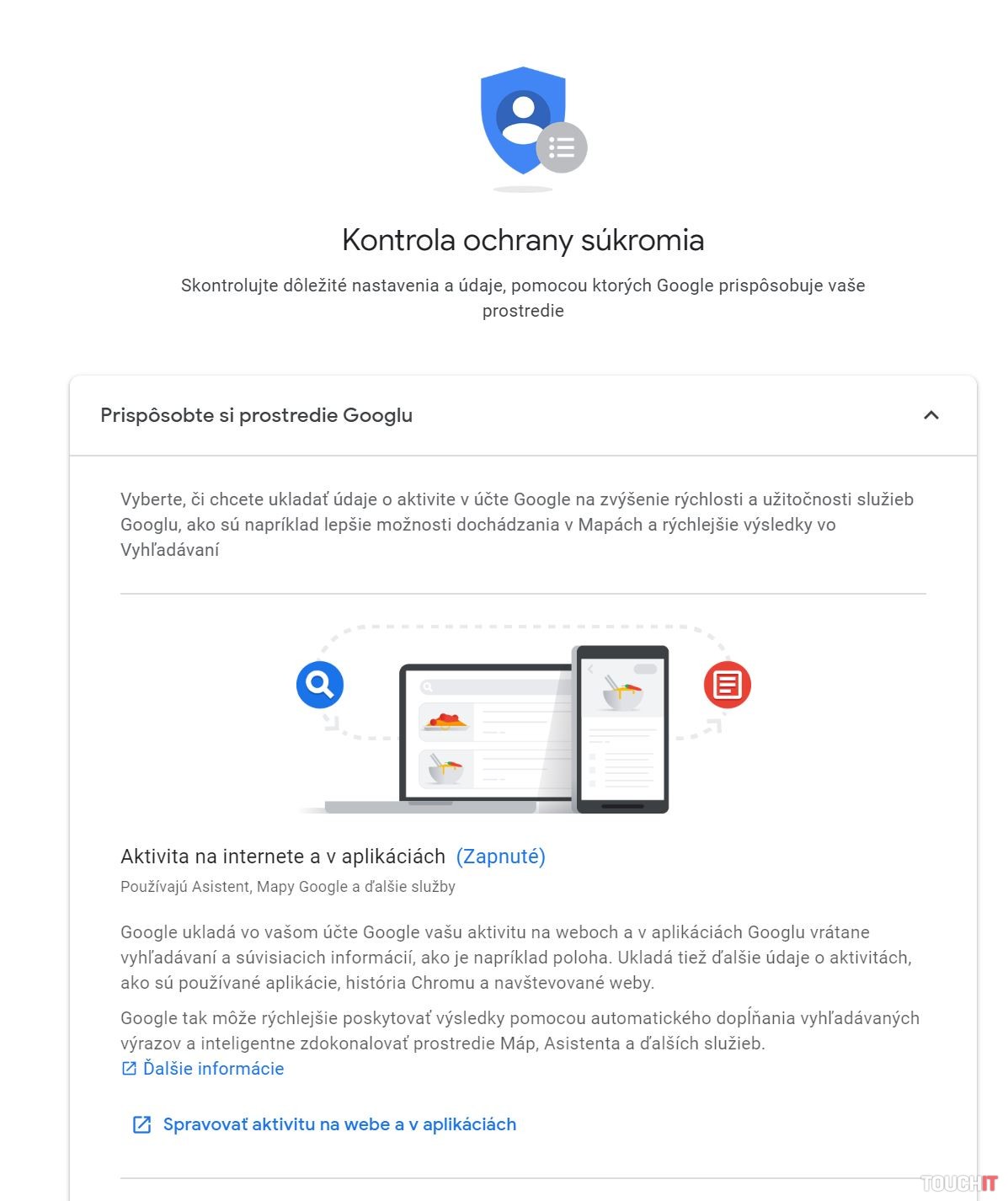 Mnohí používatelia si to možnože neuvedomujú, ale Google ukladá množstvo dát, ktoré generujete používaním jeho služieb. Tieto dáta máte pod kontrolou a môžete ich okamžite vymazať cez centrum Kontroly ochrany súkromia. Takisto môžete nastaviť, aby sa automaticky zmazali po uplynutí 3 alebo 18 mesiacov alebo nikdy. Centrum Kontroly ochrany súkromia nájdete na oficiálnom webe Googlu, na tejto stránke. K dispozícii sú tri položky – Aktivita na internete a v aplikáciách, História polohy, História na YouTube. Po kliknutí na tlačidlo ZAPNUTÉ/VYPNUTÉ si môžete tieto dáta pozrieť, manuálne ich zmazať alebo si nastaviť automatické mazanie. Kľúčová informácia k 24. júnu 2020 je, že od tohto dňa bude Google automaticky mazať dáta nových používateľov po uplynutí 18 mesiacov pre históriu polohy a 36 mesiacov pre YouTube. Tieto nastavenia sa automaticky aktivujú po zapnutí Histórie polohy, resp. histórie YouTube, keďže obe nastavenia sú štandardne vypnuté a používateľ ich musí aktivovať sám. Niekedy si to však ani neuvedomuje, lebo iba klikne na nejakú ikonu v aplikácii. Ak si teda chcete nastaviť automatické mazanie údajov a skontrolovať si vaše dáta, skontrolujte si centrum Kontroly ochrany súkromia. Čoskoro bude možné meniť a kontrolovať nastavenie súkromia aj pomocou otázok typu „Google kontrola ochrany súkromia“, či otázky typu „Je môj Google účet zabezpečený“, ktoré zadáte priamo do Googlu.Kontrola ochrana súkromia Google účtu umožňuje nastaviť automatické mazanie dát, skontrolovať ich a okamžite vymazať