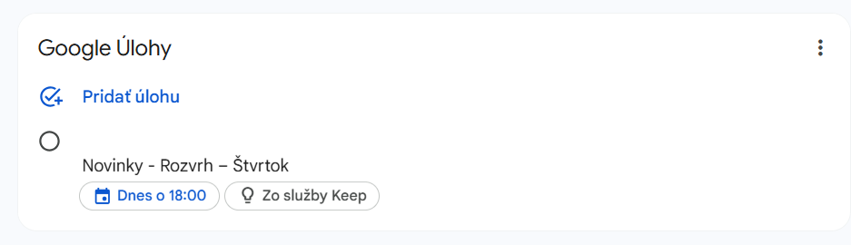 V praxi to znamená, že pripomenutie vytvorené v Google Keep sa automaticky zobrazí aj v Google Kalendár v sekcii Úlohy (prepínanie vpravo hore). Ďalej sa dá s takto vytvorenými pripomenutiami / úlohami pracovať z Google Úlohy. Možnosti budú plnohodnotné, ako keby ste úlohu vytvorili priamo tu.