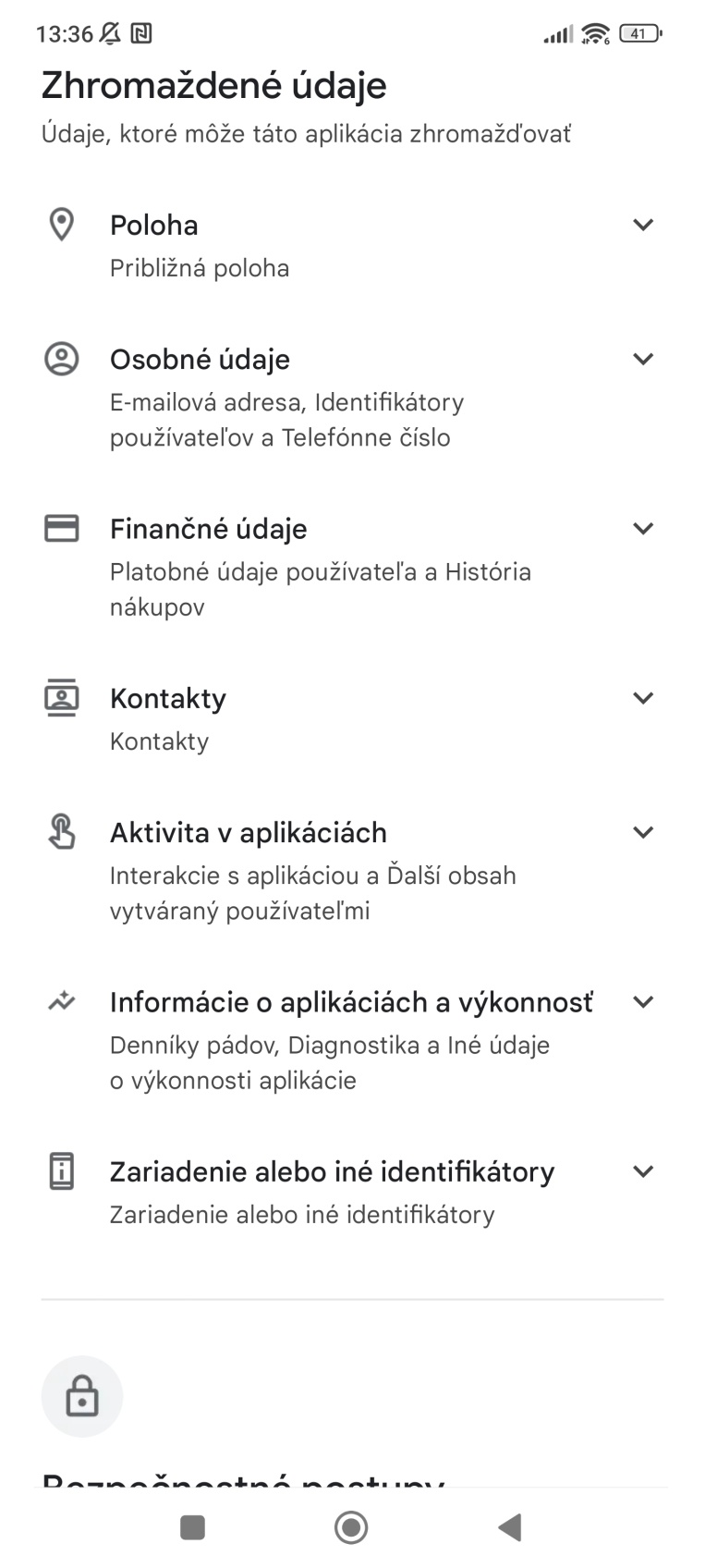 Táto sekcia bola nahradená sekciou Zabezpečenie údajov. Dozviete sa, čo aplikácia verejne proklamuje, teda lepšie a jasnejšie povedané, dozviete sa to, čo vývojári o aplikácii prezradia. Už nemusia uvádzať alebo si prístupy v závislosti na analýze aplikácie nezisťuje samotný obchod.