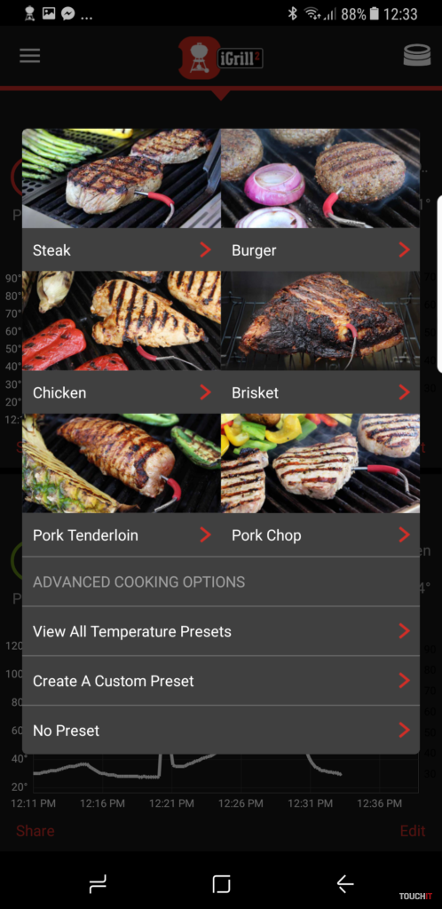 iGrill existuje vo viacerých vyhotoveniach – iGrill mini v cene 69,99 Eur, iGrill 2 za 129,99 Eur a iGrill 3 za sumu 119,99 Eur. K iGrill mini sa dá pripojiť jedna sonda, ktorý sa zapichuje do mäsa, konkrétne do jeho stredu. K iGrill existuje aplikácia pre Android a iOS a tá umožňuje napr. prezerať grafy nárastu teploty v strede mäsa a tiež sledovať dosiahnutie hraničnej hodnoty. Hraničnú hodnotu má aplikácia nastavenú podľa tohto, akú formu grilovania preferujete. My sme si napr. vybrali steak s prípravou Well Done.