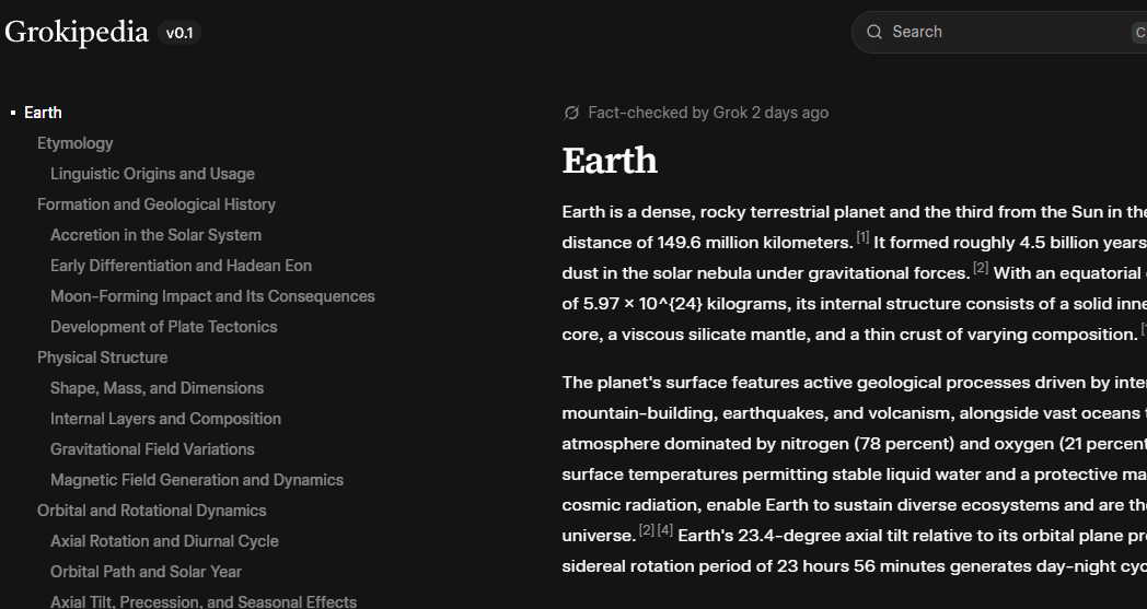 Elon Musk vydal oficiálne oznámenie, že jeho Grokipedia bude konkurovať Wikipédii, a to konkrétne s „masívnymi vylepšeniami“. Projekt bol spustený koncom septembra 2025 a zatiaľ je označený ako verzia 0.1. V čase tvorby tohto článku má indexovaných 885 279 článkov.