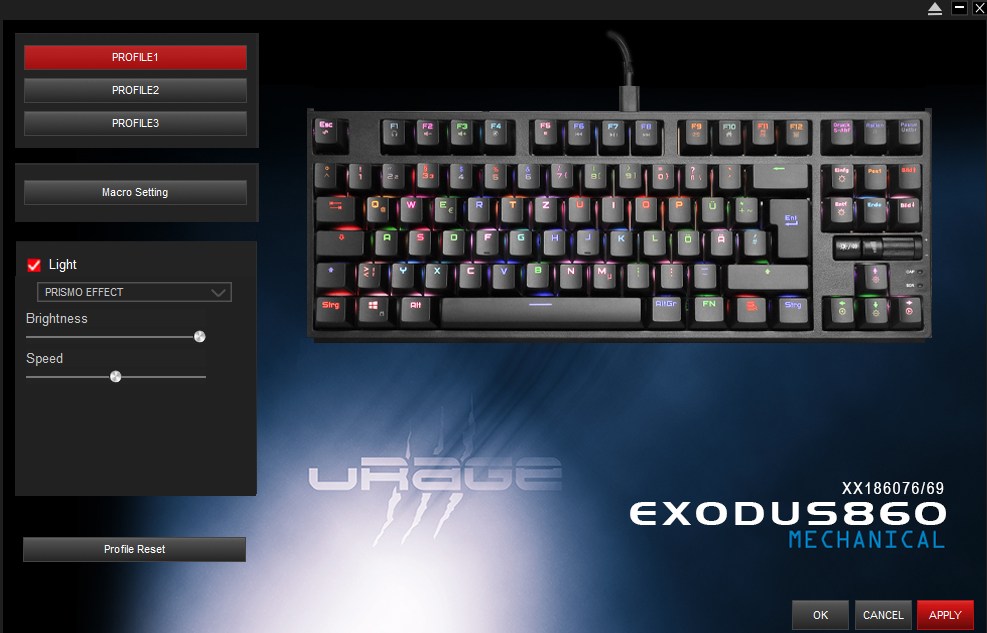 Exodus 860 na stole hráča nezaberie príliš veľa miesta. Klávesnica je v prevedení Slim Size, čiže bez numerickej časti. Všetky klávesy majú RGB podsvietenie s reguláciou jasu a farebnými efektmi, ktoré je možné detailne nastaviť priamo v aplikácii, alebo na klávesnici pomocou otočného mechanického regulátora, ktorým je možné ovládať aj hlasitosť.