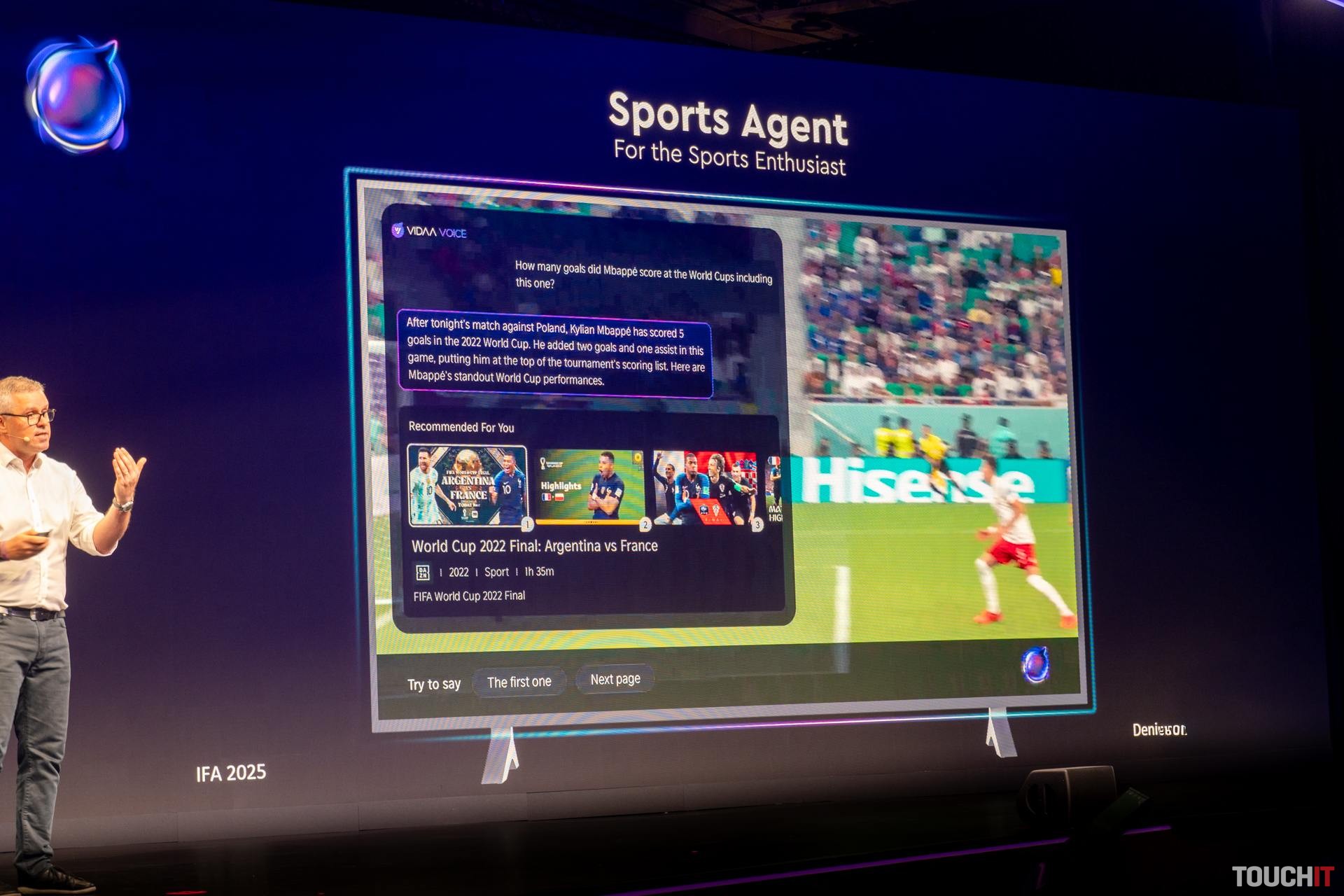 Denis Oštir, Editor in Chief VIDAA USA práve vysvetľuje ako je možné v hovorenej reči komunikovať s Hisense televízorom o aktuálnom zápase