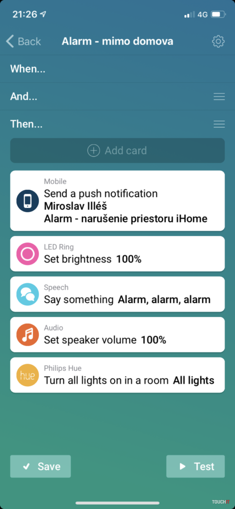 „Kombinovať môžete podmienky času, dátumu, ročného obdobia, západu/východu slnka, prítomnosti osôb v domácnosti, polohy, aktivácie zariadení, zmeny stavu, alarmu, už vytvorených scén a pod. Príklady scén je ťažko uvádzať, nakoľko veľa záleží od toho, aké zariadenia budete používať a ako sa majú v súčinnosti s ostatnými funkciami správať. Nakombinovať sa dajú skutočne rôznorodé zariadenia, ktoré budú pracovať na základe rôznych, aj naozaj netradičných podmienok. Bežným príkladom sú scény – ráno, večer, noc a odchod/príchod z/do domu alebo neprítomnosť. Každá scéna sa bude automaticky riadiť podľa vašich nastavení a želaní.“