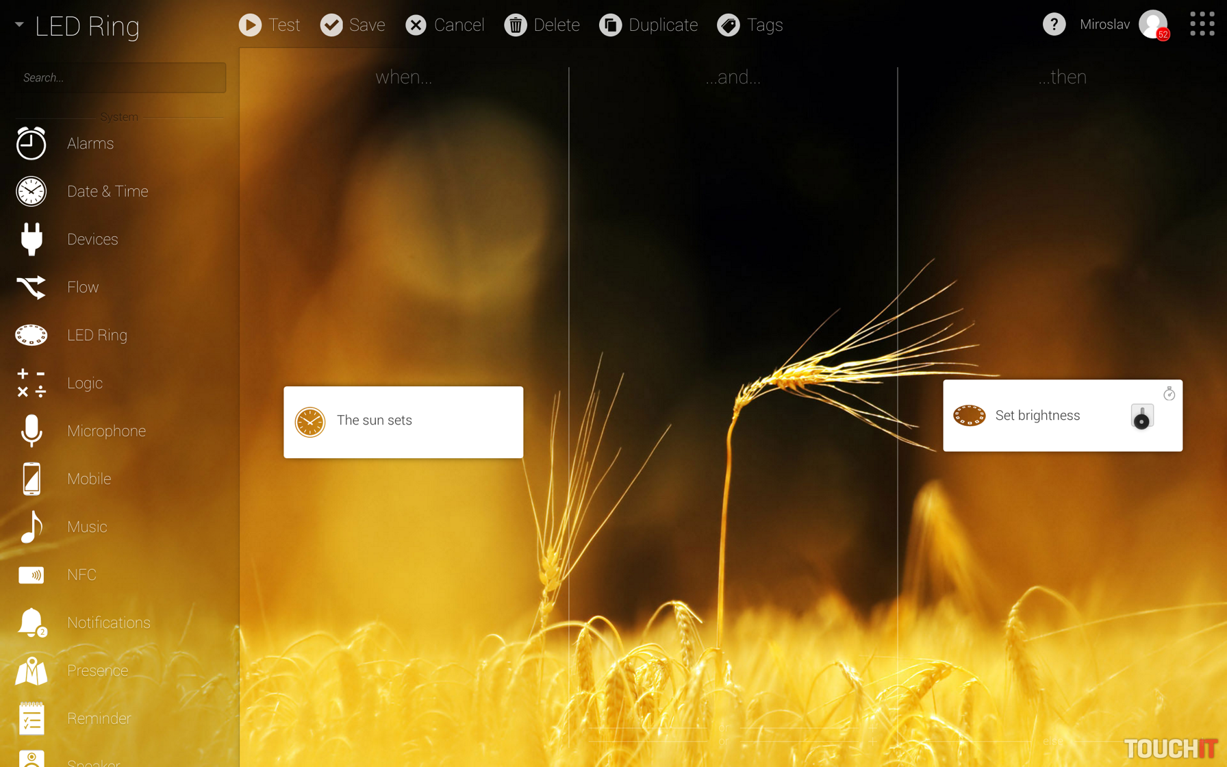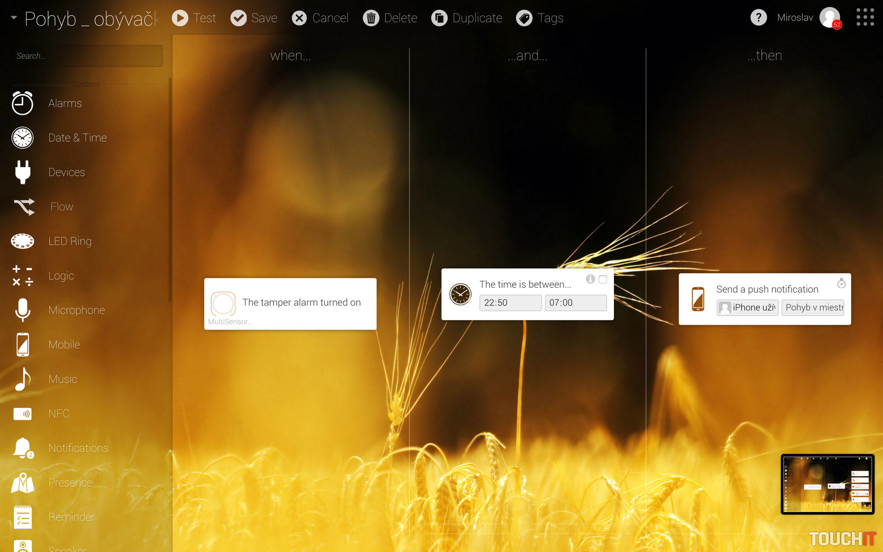 „Ráno sa vytiahnu žalúzie, s východom slnka sa zapne príjemné teplé svetlo, iba v zime a začne sa príprava kávy atď. Možností je nespočetne veľa. Výborná scéna, ktorú radi používame je „odchod z domu“. Po opustení domu/bytu spustíme túto scénu (alebo sa spustí po zistení neprítomnosti sama), pričom sa všetky nepotrebné spotrebiče vypnú, zníži sa kúrenie a ak sa niekde svieti, tak systém tieto svetlá vypne. Taktiež už počas cesty domov aplikácia sleduje vašu polohu, pričom sa pred návratom spustí kúrenie, svetlá a pod. To je fajn, nie?“