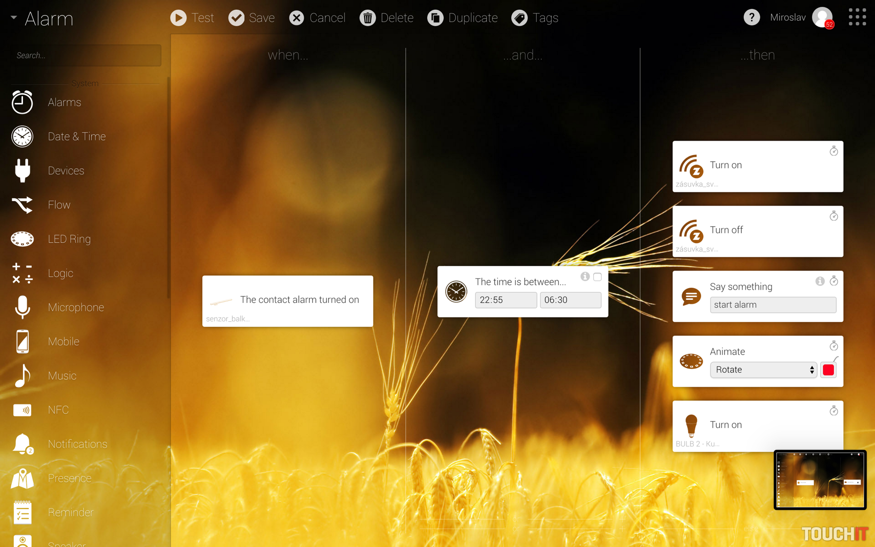 Kombinovať môžete podmienky času, dátumu, ročného obdobia, západu/východu slnka, prítomnosti osôb v domácnosti, polohy, aktivácie zariadení, zmeny stavu, alarmu, už vytvorených scén a pod. Scény môžete spúšťať aj NFC tagom, ktorý priložíte k riadiacej jednotke, tá slúži ako čítačka. Príklady scén je ťažko uvádzať, nakoľko veľa záleží od toho, aké zariadenia budete používať a ako sa majú v súčinnosti s ostatnými funkciami správať. Nakombinovať sa dajú skutočne rôznorodé zariadenia, ktoré budú pracovať na základe rôznych, aj naozaj netradičných podmienok. Bežným príkladom sú scény – ráno, večer, noc a odchod/príchod z/do domu alebo neprítomnosť. Každá scéna sa bude automaticky riadiť podľa vašich nastavení a želaní.