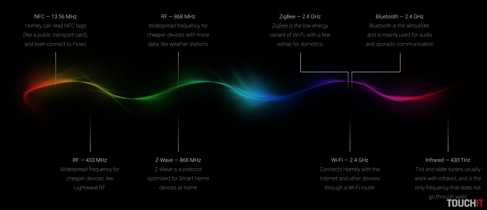 „Základným pilierom, na ktorom Homey stavia je, že dokáže komunikovať s rôznymi bezdrôtovými protokolmi a spojiť tak skutočne odlišné zariadenia do jedného celku a donútiť ich, aby medzi sebou komunikovali tak, ako by ich jedna mater mala. A v skutočnosti to tak je. Homey si rozumie so – Z-Wave, Zigbee, Wi-Fi, Bluetooth LE, 433MHz, 868MHz, IR a NFC. Verte, viac potrebovať nebudete.“