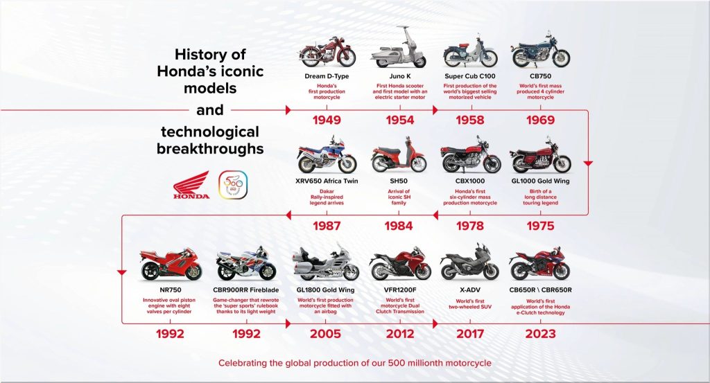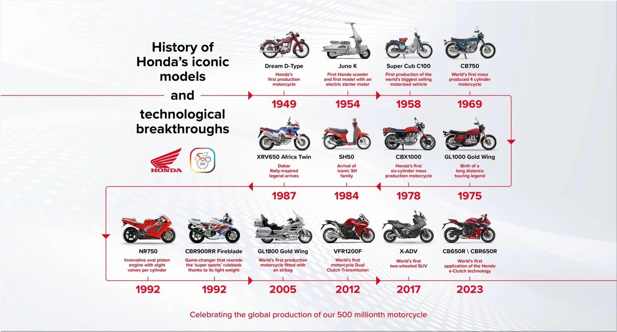 Honda, v praxi najväčší výrobca motocyklov a skútrov, predala od svojho počiatku v roku 1949 pol miliardy motocyklov. Áno, za posledných 76 rokov sa predalo viac ako 500 miliónov motocyklov.