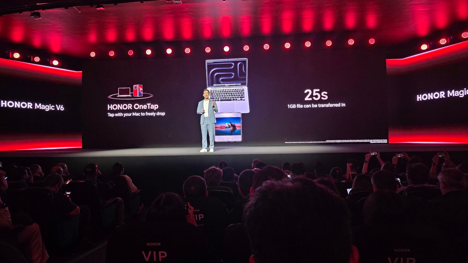 Zaujímavým momentom prezentácie bola interoperabilita s ekosystémom Apple. Magic V6 totiž dokáže fungovať ako rozšírený displej pre Apple Mac, umožňuje bezdrôtové prehliadanie súborov, prístup k iCloudu a podporu softvérového balíka iWork. Funkcia One Tap Share umožňuje rýchly prenos medzi macOS, iPhonom a HONOR zariadeniami.