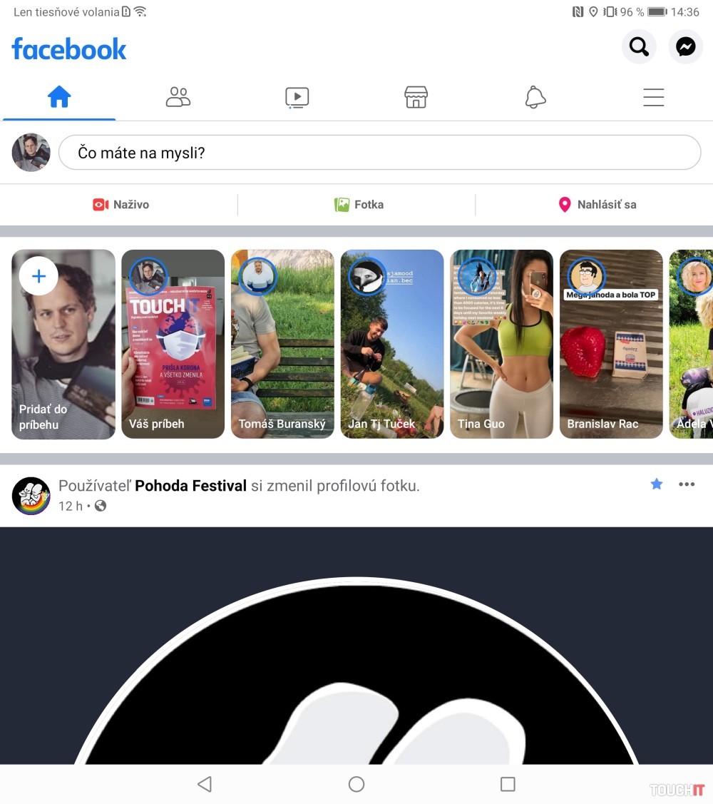 Aplikácia Facebook. Zľava: Otvorený displej, aplikácia v smartfónovom a v tabletovom režime. Následne zatvorený displej, aplikácia v smartfónovom a tabletovom režime. Smartfónový režim znamená, že sme Facebook spustili, keď bol Mate Xs zatvorený. Tabletový režim je, keď aplikáciu spustíme s otvoreným Mate Xs