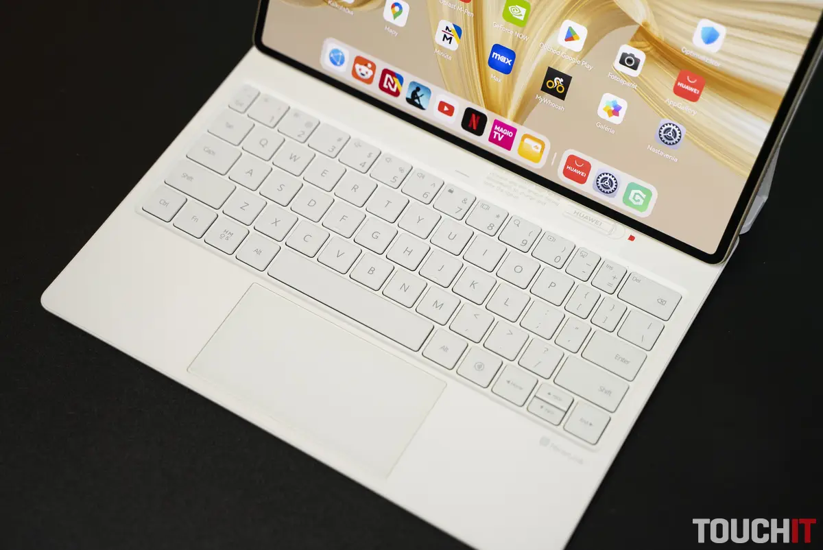 Klávesnica má nízky profil a píše sa na nej pohodlne. Spätná väzba je na pomery tabletov skvelá. Pokiaľ budete chcieť použiť QWERTZ rozloženie, nainštalujte si aplikáciu Extra Physical Keyboard Layouts.