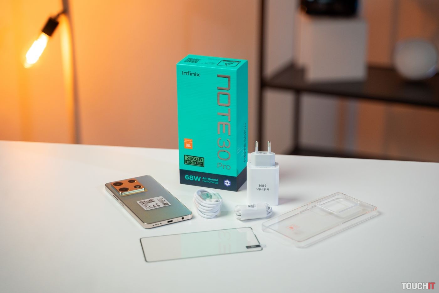 Infinix Note 30 Pro: Súčasťou balenia je ochranné sklo, ochranný obal, 68 W nabíjačka, slúchadlá a USB-C kábel