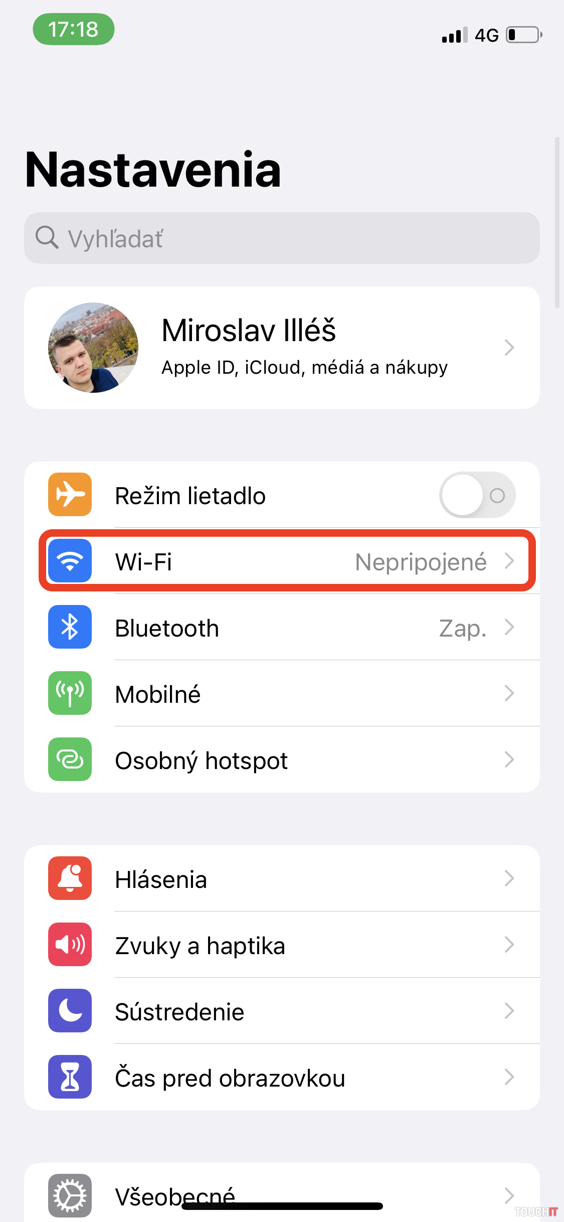 - Otvorte nastavenia a následne klepnite na položku – Wi-Fi.
