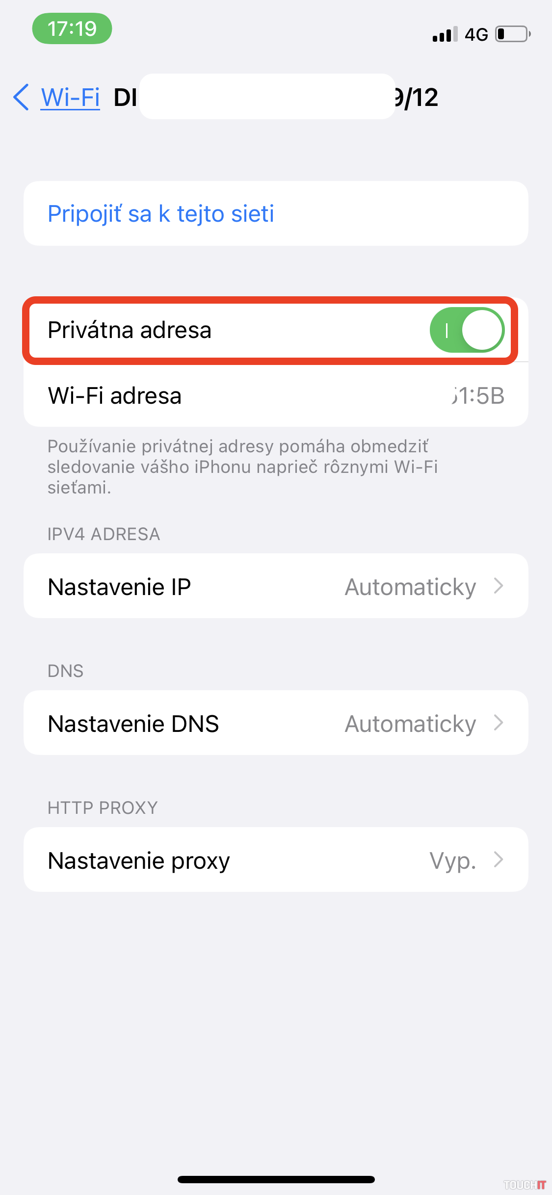 - Klepnutím zapnite alebo vypnite možnosť Privátna adresa.