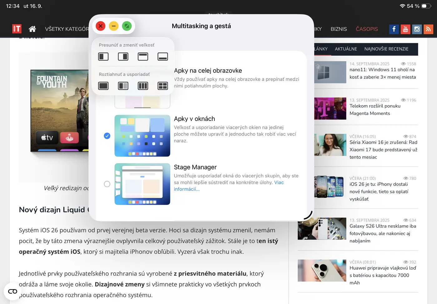 Najväčšou novinkou systému iPadOS 26 je kompletne prepracovaná práca s viacerými oknami. Tablet ponúka niekoľko spôsobov používania, medzi ktorými sa môžete prepínať v Nastaveniach > Multitasking a gestá.
