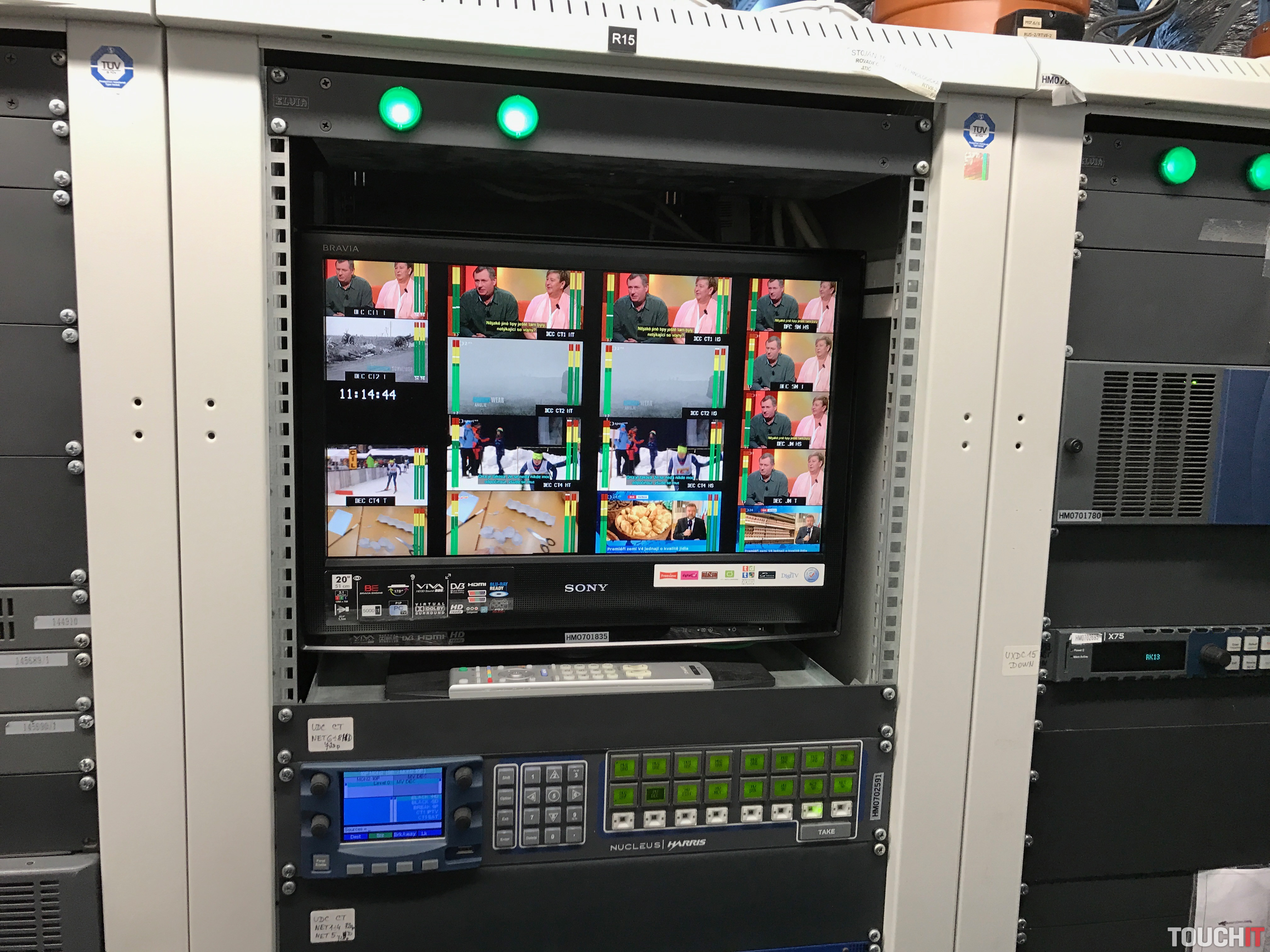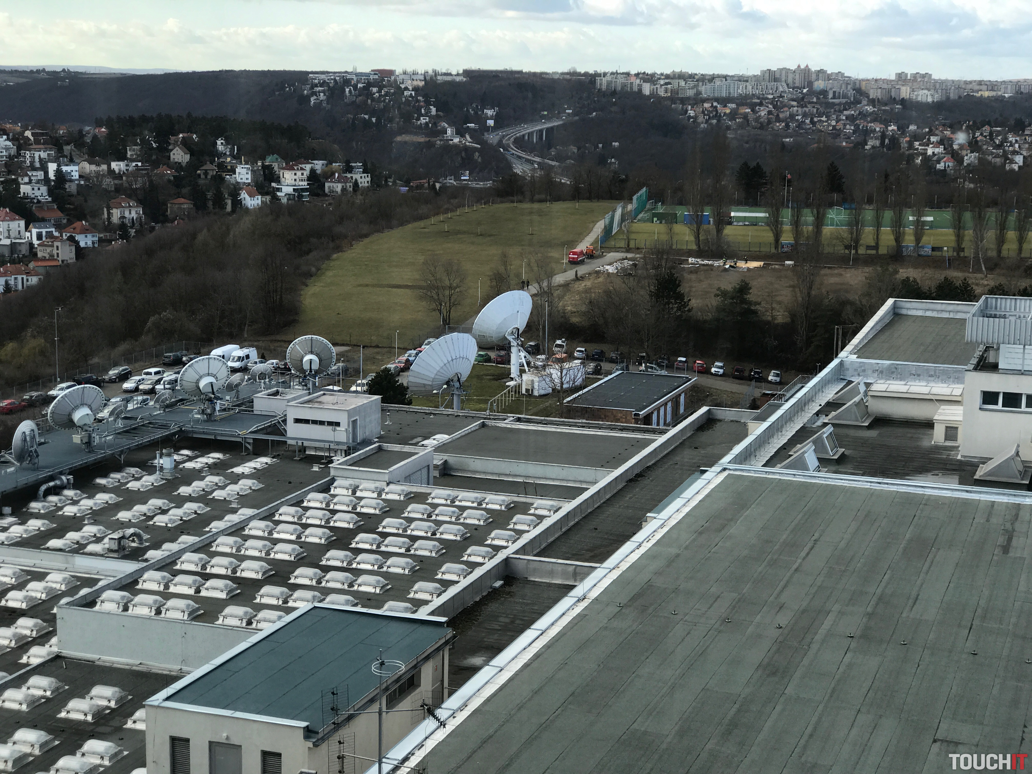 Čo sme však videli v plnej kráse, je okolie Prahy z desiateho poschodia budovy ČT, na ktorom sa nachádza aj dátová miestnosť vysielacích technológií. V nej sme videli množstvo prístrojov a technológií na vysielanie pozemného (DVB-T), ako aj satelitného signálu.