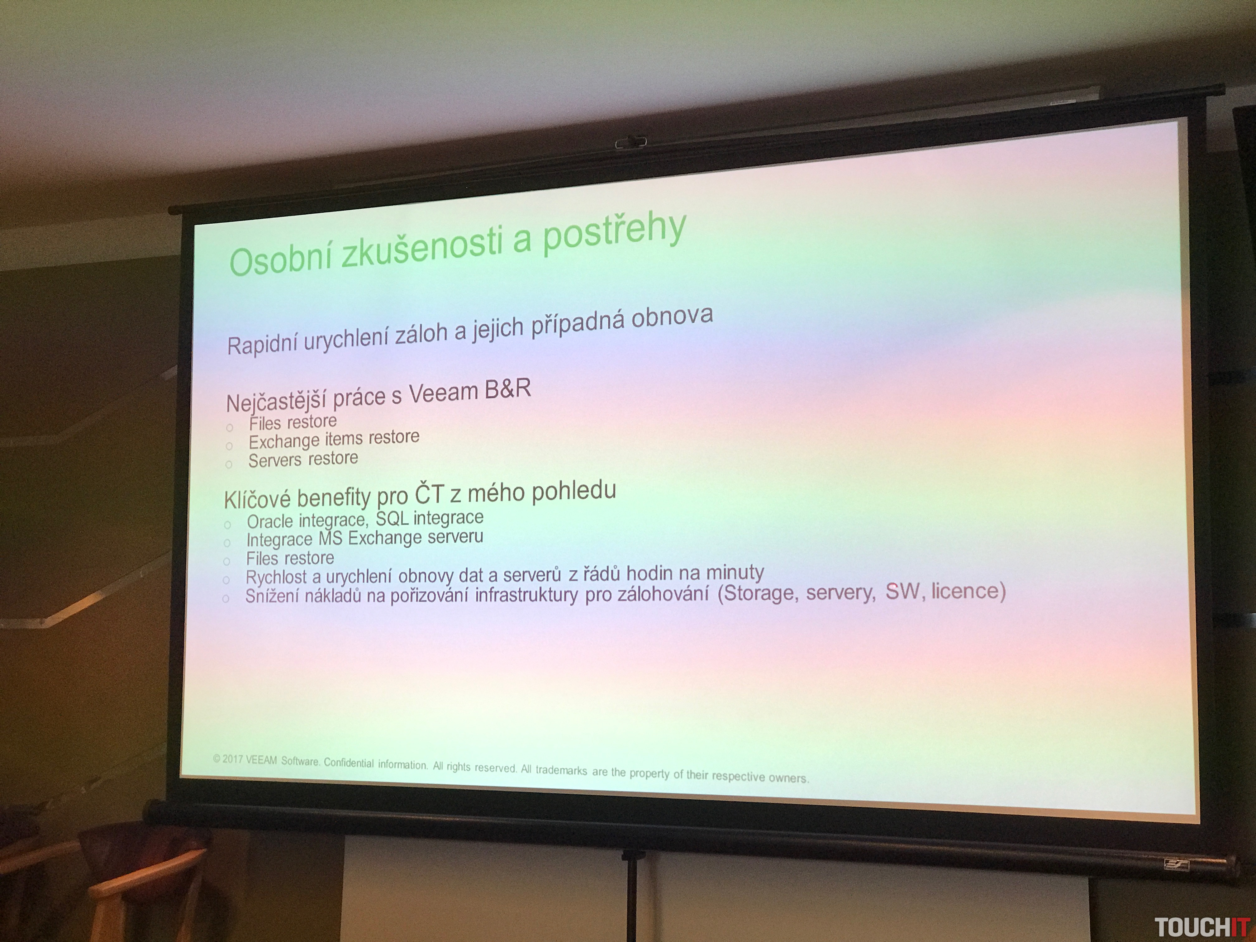 Následne sme si vypočuli reálne a praktické využitie Veeamu v českej televízii, od Petra Kunčíka – systémového administrátora českej televízie. Pán Kunčík hovoril o tom, aká je pre jeho prácu a celkovo pre českú televíziu dôležitá adaptácia Veeam softvéru.