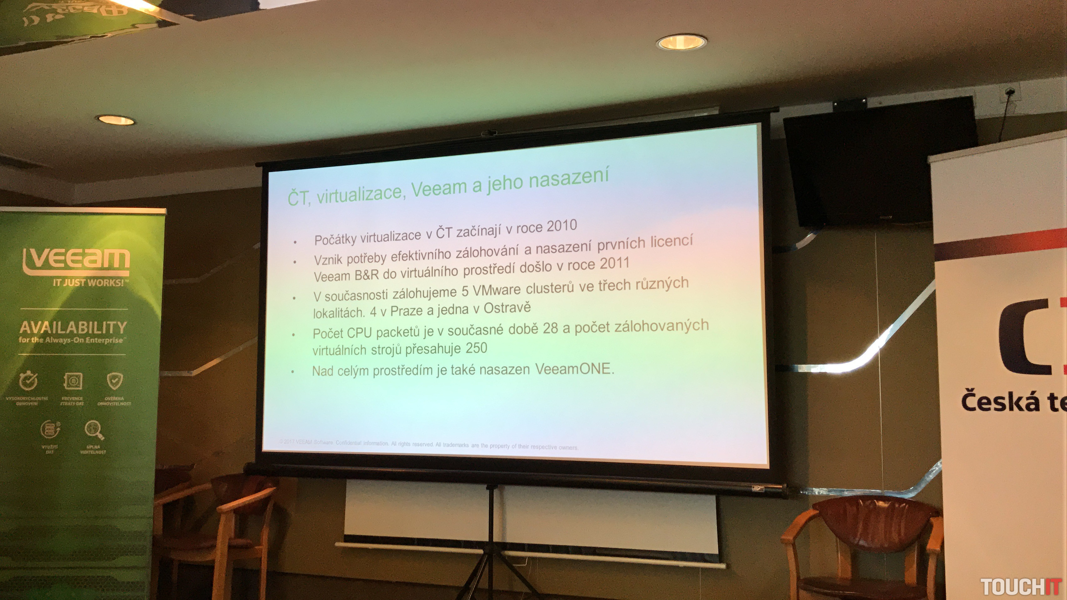 Včerajší deň sme strávili zaujímavou prehliadkou českej televízie – ČT. Videli sme množstvo zaujímavých priestorov a zákulisných dianí, čo nám dalo úplne iný pohľad nato, čo a ako vidíme v televízii. Základom našej „tour“ bola krátka prezentácia spoločnosti Veeam, ktorá má svoj softvér nasadený v českej televízii už od roku 2011. O tom, čo Veeam za posledné roky dosiahol a čo plánuje do budúcna, nám porozprával regionálny riaditeľ Veeam pre Česko, Slovensko a Maďarsko – Martin Štetka.