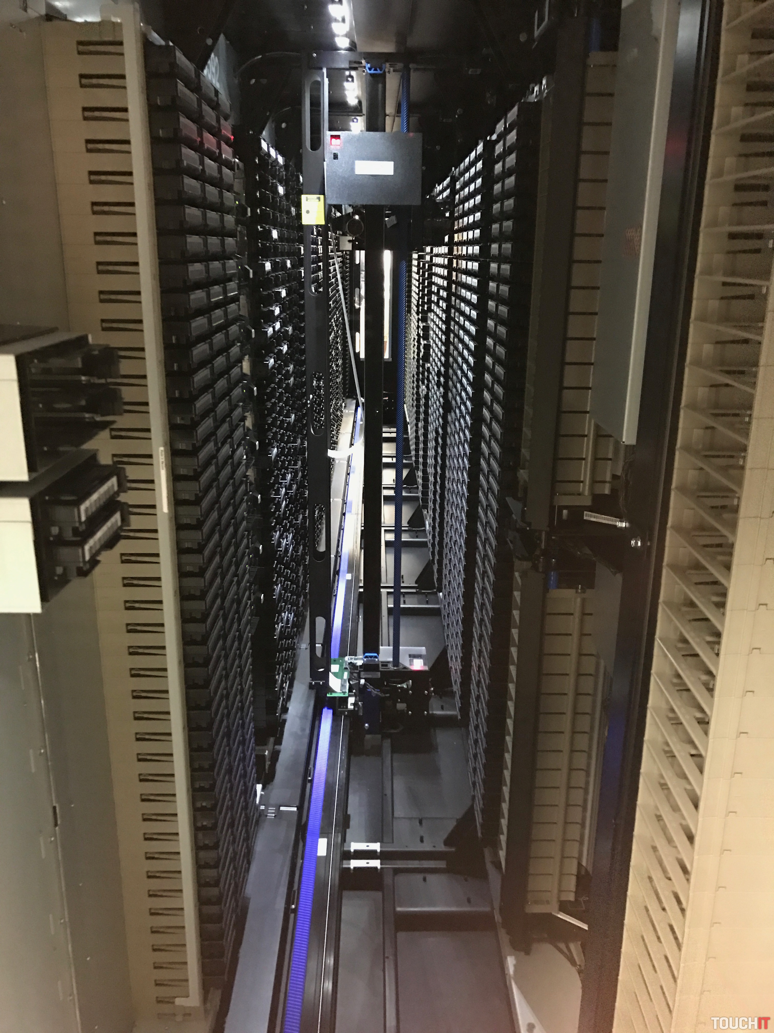 Pokračovali sme do dvoch veľkých „knižníc“, vraj najväčších v českej republike, ktoré slúžia na digitálnu archiváciu, prenos, ako aj na celkovú digitalizáciu ČT. Prístroj si vložené „kazety“ s médiom automaticky zoberie, označí a rozloží podľa potreby. Človek do tohoto systému zasahovať nemusí, jedine cez počítač. Ak sa niektoré pohyblivé rameno pokazí, ďalšie ho zoberie, odtlačí a robí prácu za neho.