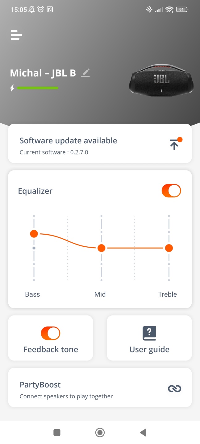 Gratulujem výrobcovi, presne pochopil, čo niekomu môže prekážať. Teraz je možnosť sprievodné zvuky vypnúť. Tlačidlo PartyBoost umožní prepojenie dvoch do sterea alebo viacerých reproduktorov za sebou, ktoré podporujú túto funkciu. Samostatné tlačidlo ale máte aj na reproduktore.